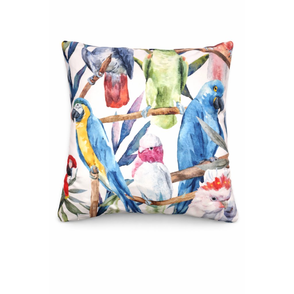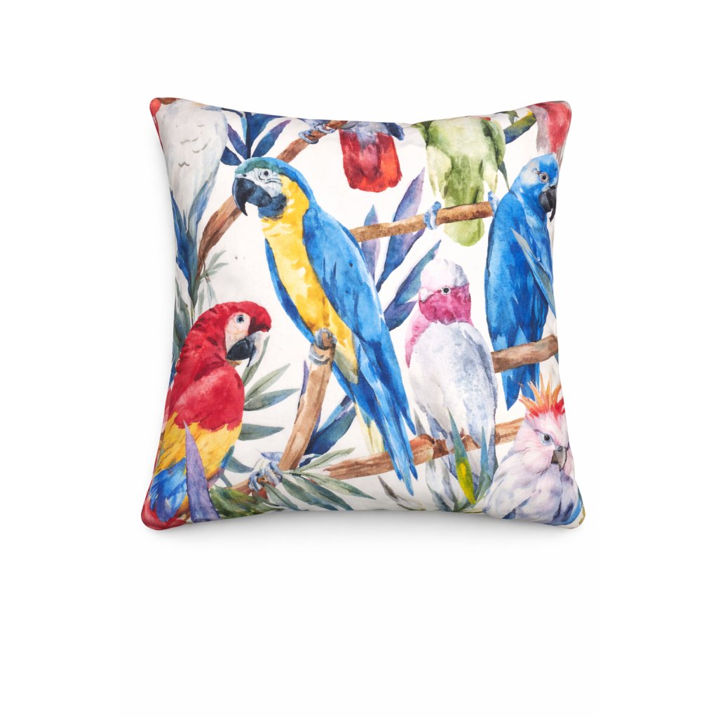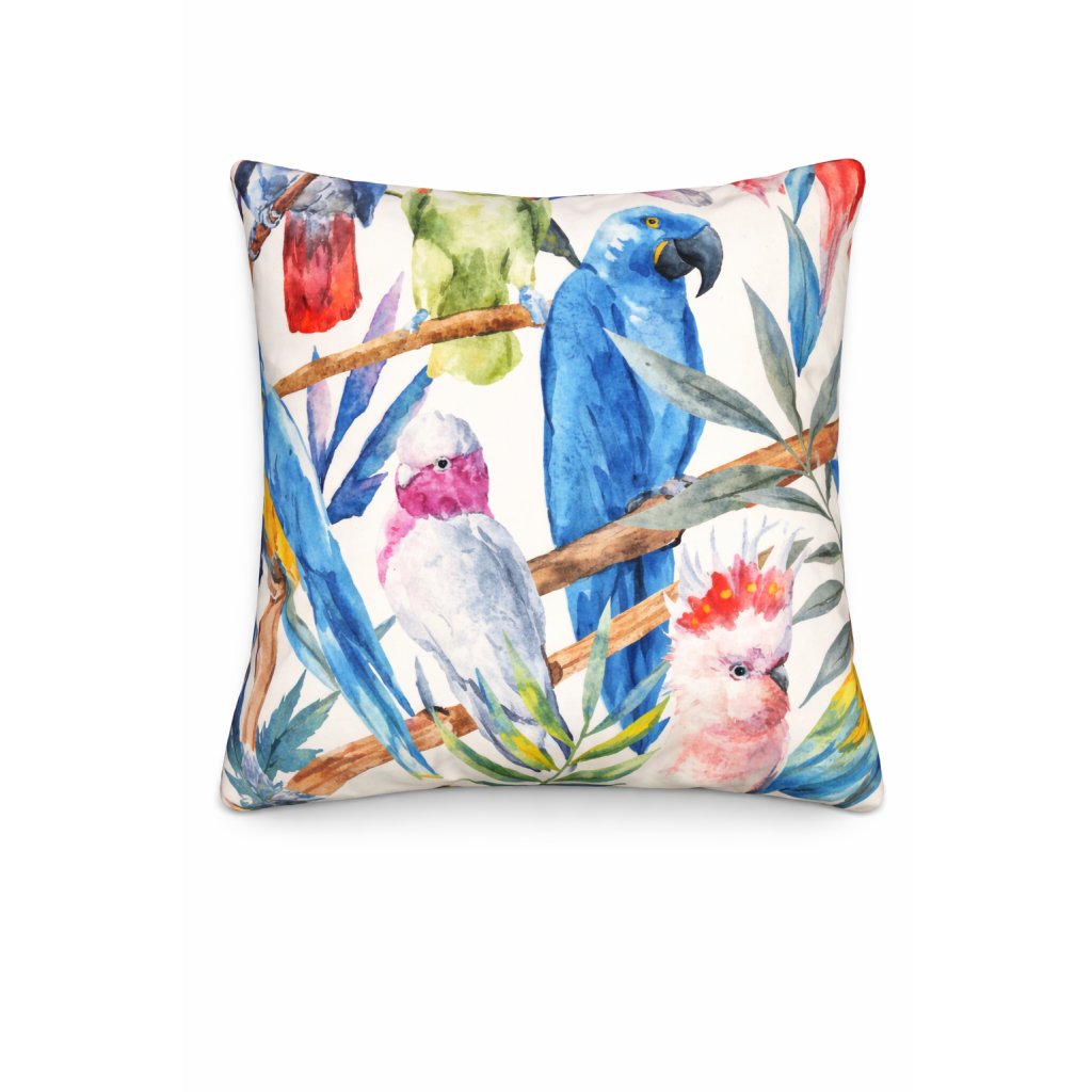 Dekorační polštář Tropical Parrots zaujme výraznými ilustracemi barevných papoušků a tropických listů ve stylu akvarelu. Kombinace modré, červené, zelené a žluté vytváří hravý, svěží a optimistický design, který přitáhne pozornost na první pohled.
