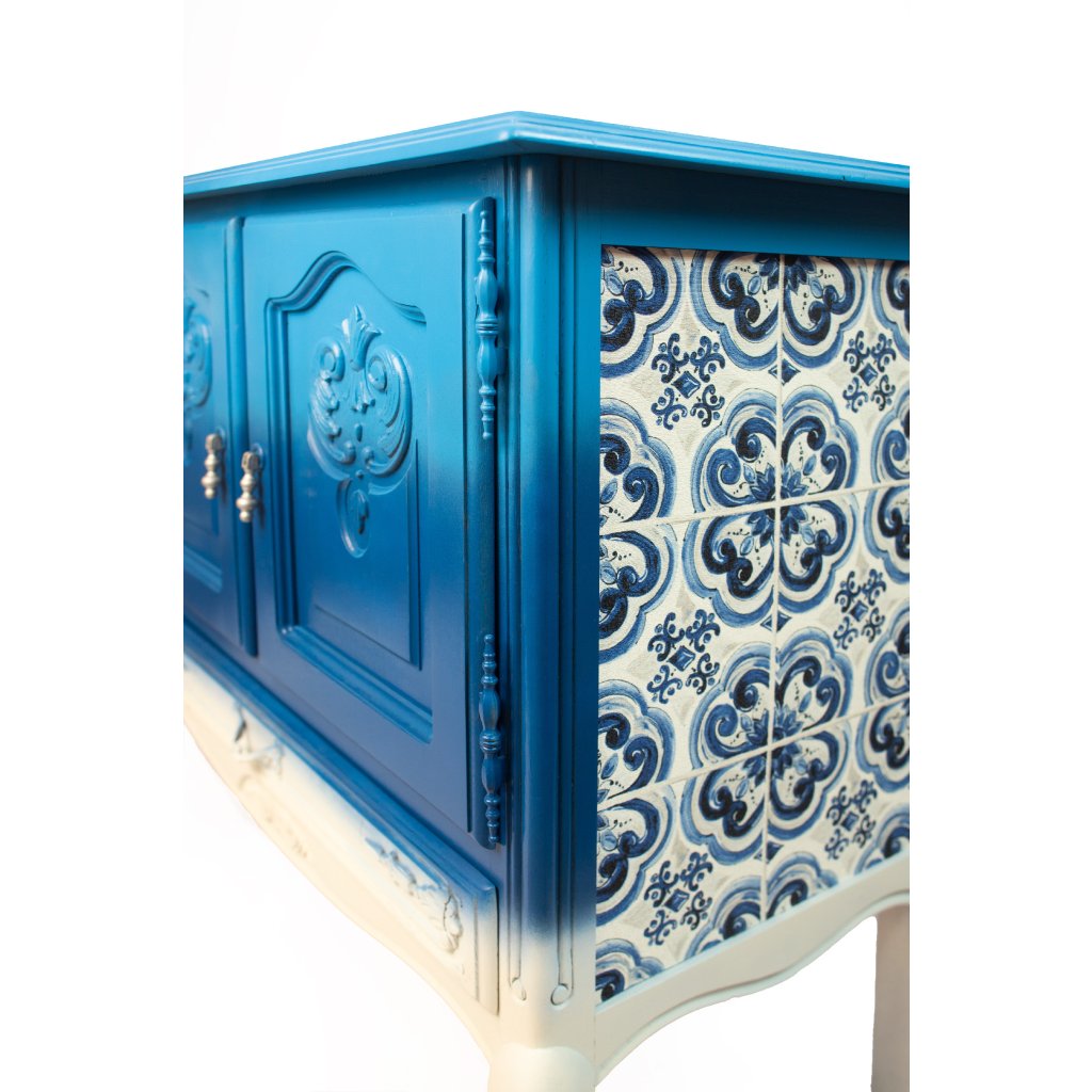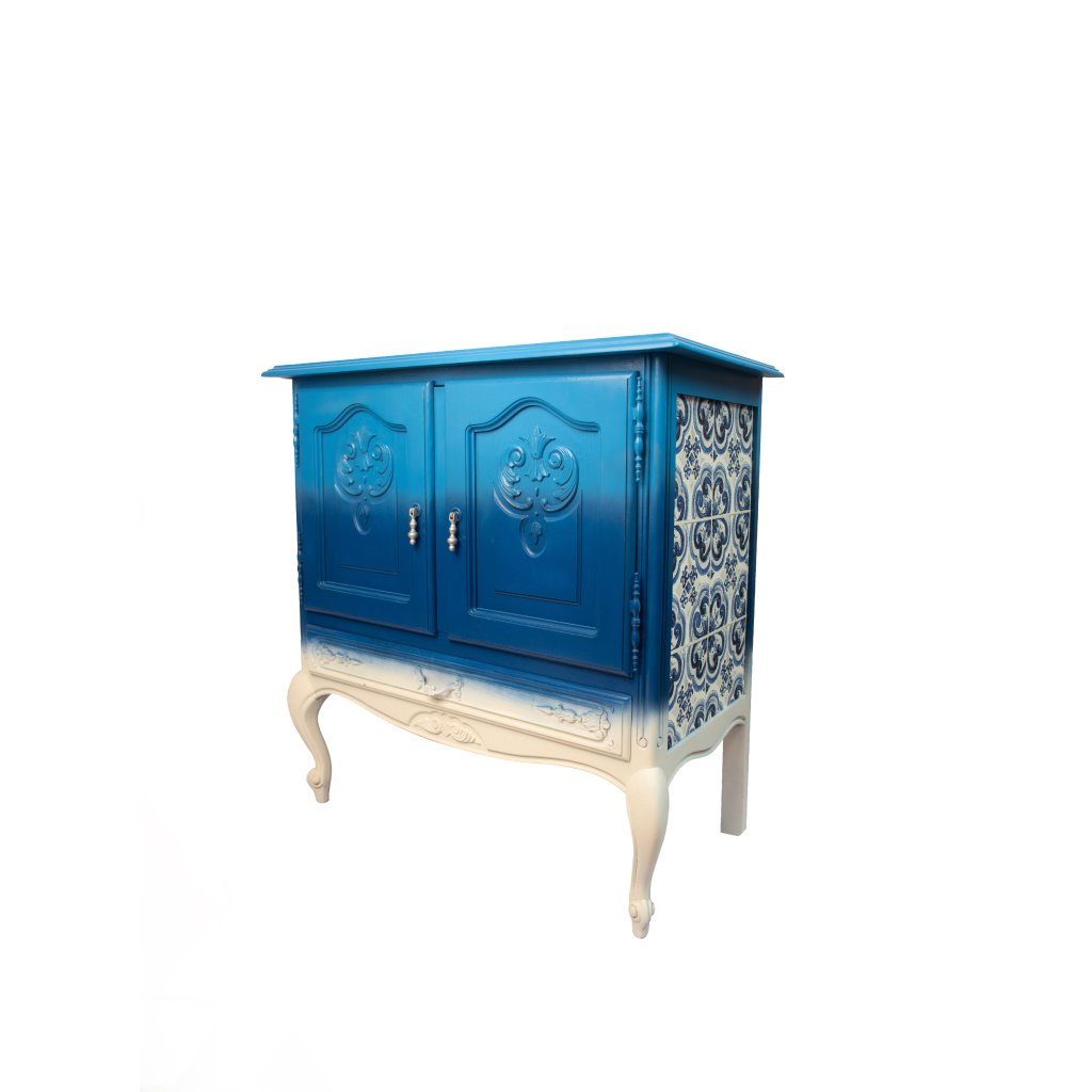 Designová komoda Blue Belle je výrazným a přesto elegantním kusem nábytku, který propojuje klasickou francouzskou siluetu s moderním barevným pojetím. Horní část komody přechází z hluboké modři do jemného světlého tónu ve spodní části, čímž vzniká harmonický a vizuálně velmi atraktivní ombré efekt.