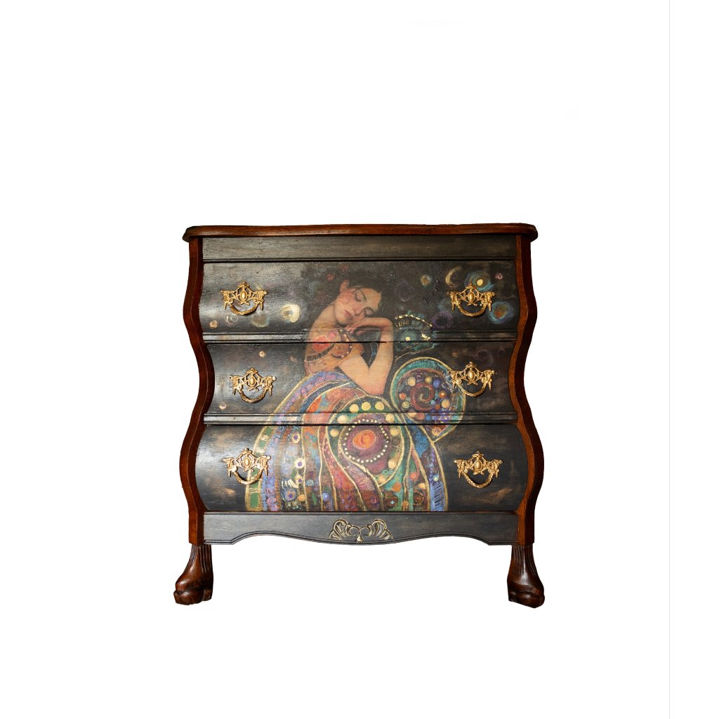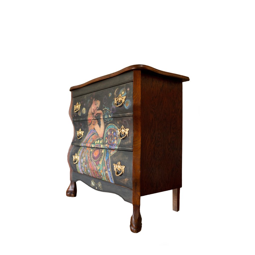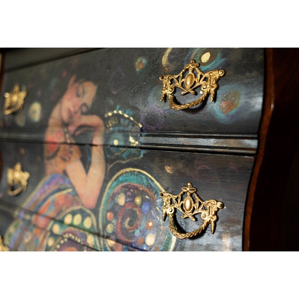 Kombinace tmavého patinovaného povrchu, jemného lesku a bohaté barevnosti motivu působí elegantně a harmonicky. Každý kus je originál díky ruční aplikaci decoupage a následné domalbě, která dodává obrazu hloubku a strukturu.