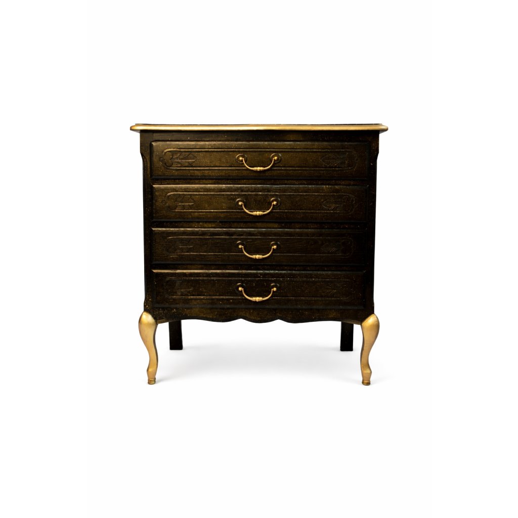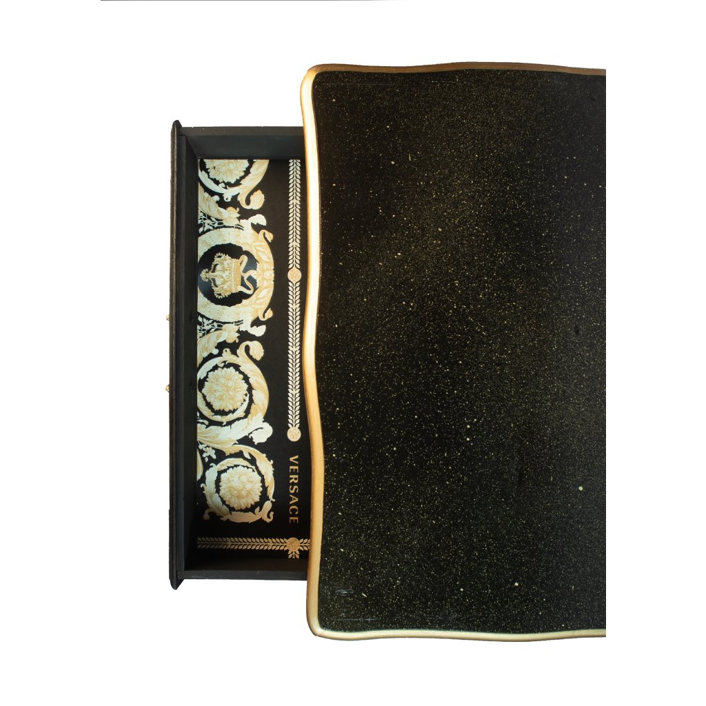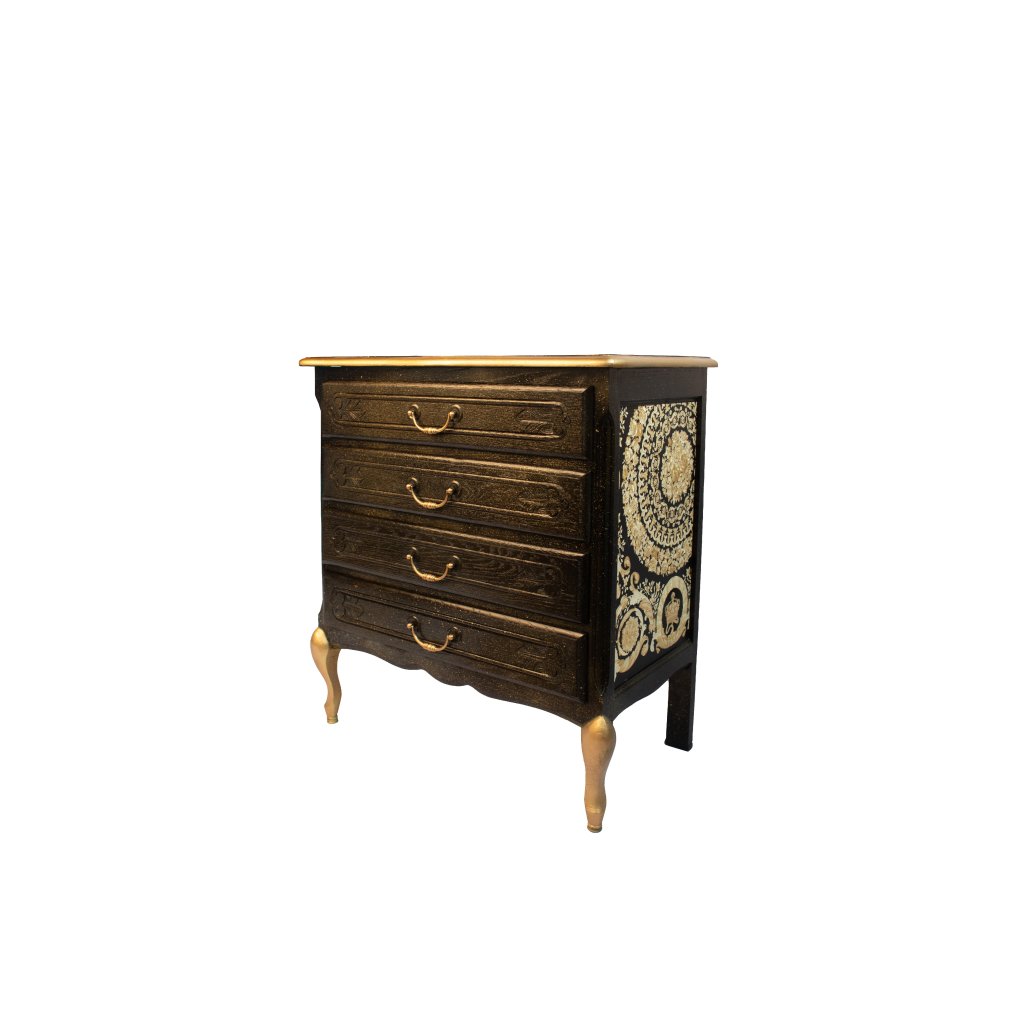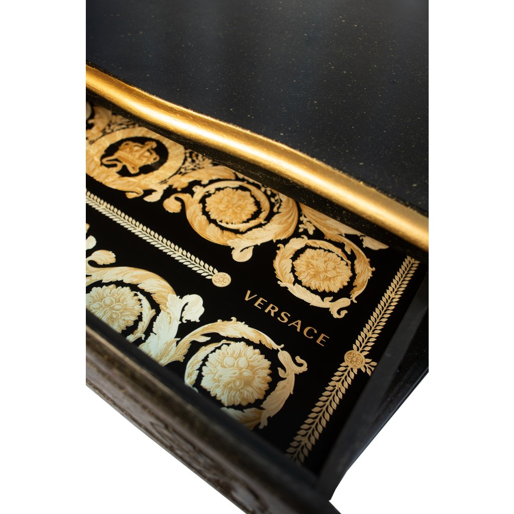 Designová komoda v noblesním černo-zlatém provedení, která v sobě spojuje klasickou eleganci s výrazným luxusním akcentem. Tmavý matný povrch s jemnou patinou krásně kontrastuje se zlatými nohami, úchytkami a horní deskou. Skrytým, ale velmi působivým detailem jsou originální tapety Versace umístěné na bocích komody a uvnitř zásuvek, které dodávají kusu jedinečný charakter a exkluzivní dojem. Komoda se skvěle hodí do elegantních interiérů, ložnic, obývacích pokojů i luxusních butikových prostor.