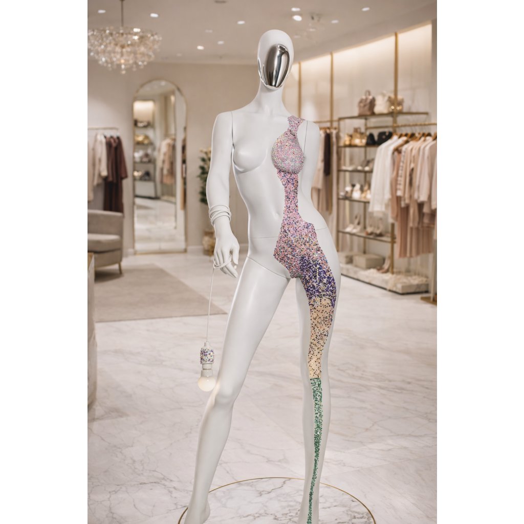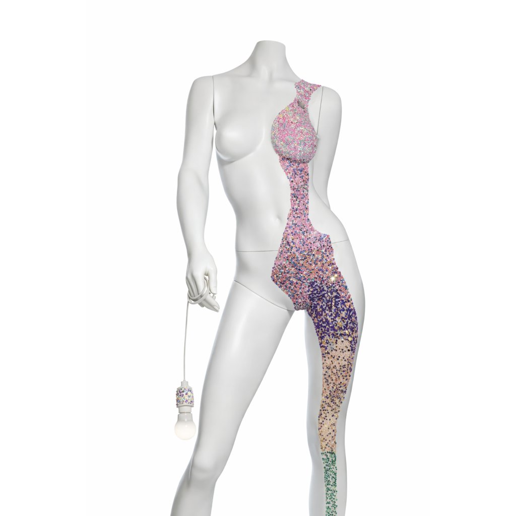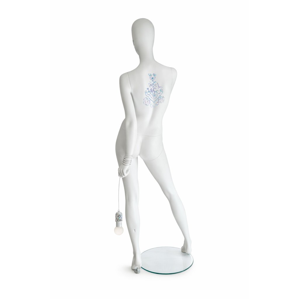 Lumière Art spojuje funkčnost figuríny a atmosféru dekorativního svítidla v jeden výrazný designový objekt. Elegantní ženská silueta v lesklém bílém provedení je doplněna ručně zdobenou aplikací z barevných kamínků a originálním závěsným světlem, které drží v ruce.