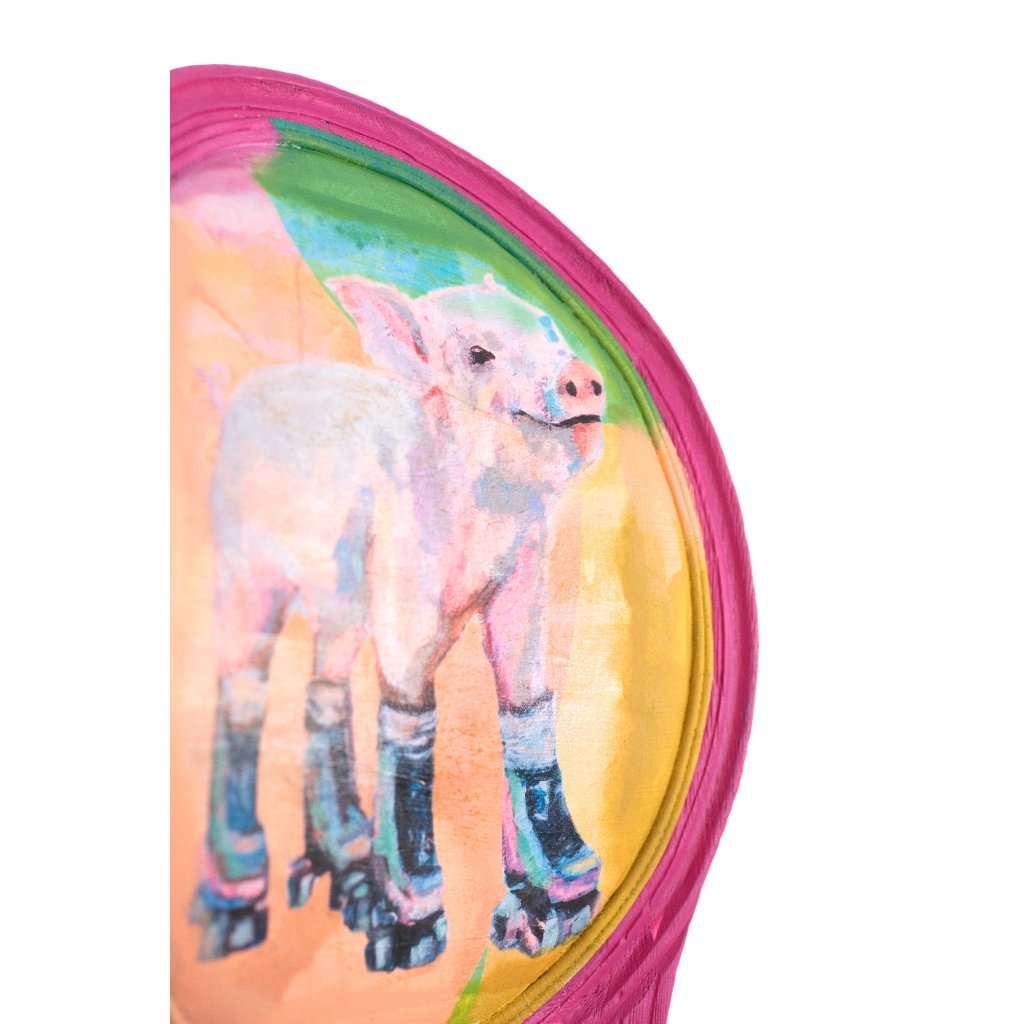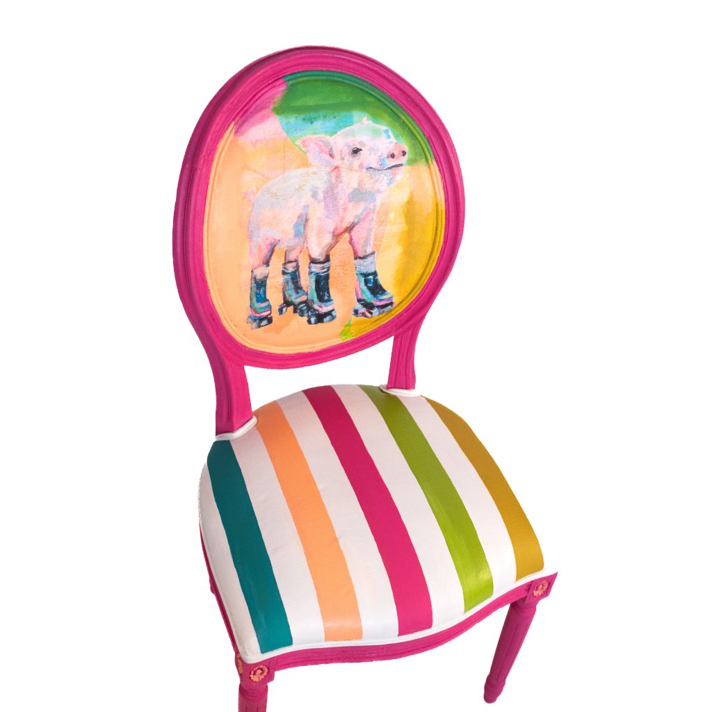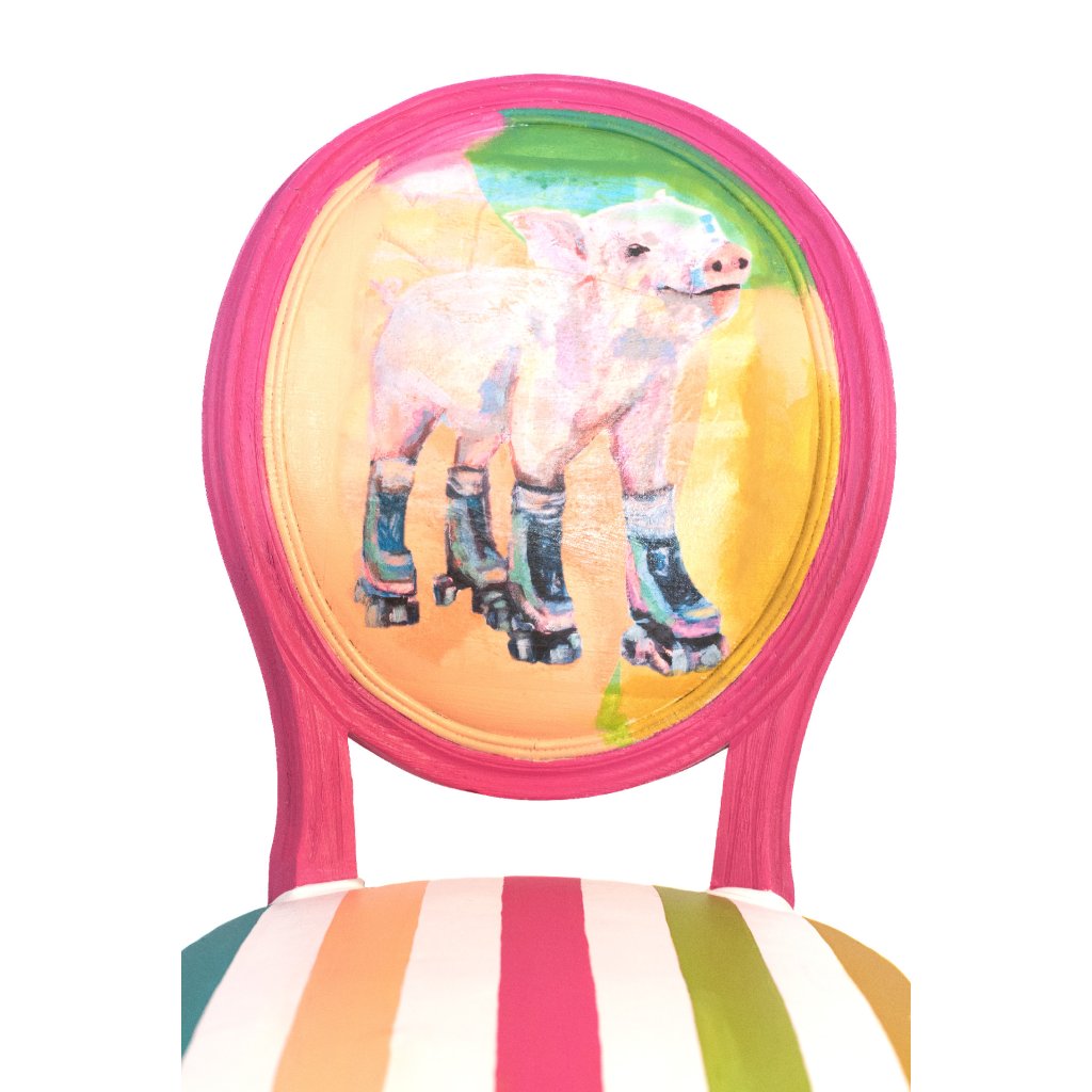Designová židle František na kolečkách je originální solitér, který v sobě spojuje jemný humor, pastelovou barevnost a poctivou ruční práci. Motiv prasátka na kolečkových bruslích vznikl technikou decoupage a je následně ručně domalovaný, aby přirozeně splynul s celkovou barevnou kompozicí židle.