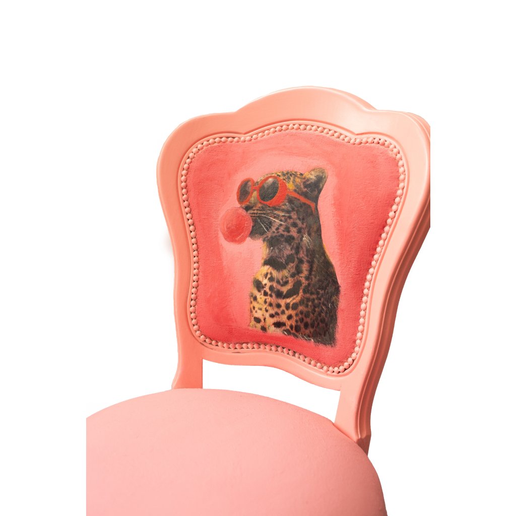 „Královna džungle“ spojuje něžnost pastelových barev s hravou noblesou exotického motivu. Elegantní silueta klasické židle dostala nový výraz díky kombinaci technik decoupage a domalby, která dává obrazu hloubku a osobitost. Motiv leopardí královny s růžovou žvýkačkou působí lehce provokativně, vtipně i stylově zároveň — a promění každý interiér v místo s charakterem. Každý kus je originál vytvořený ručně s důrazem na detail, harmonii barev a jemnou patinu.
