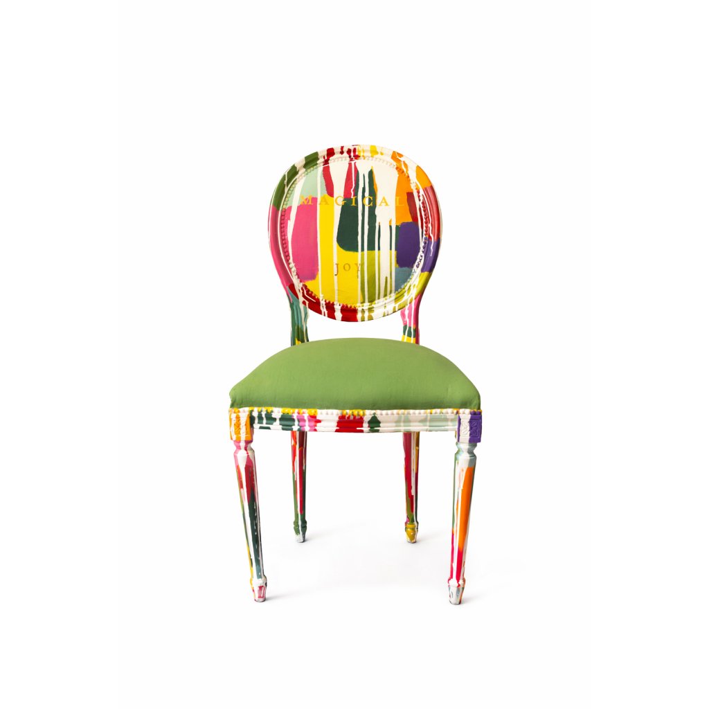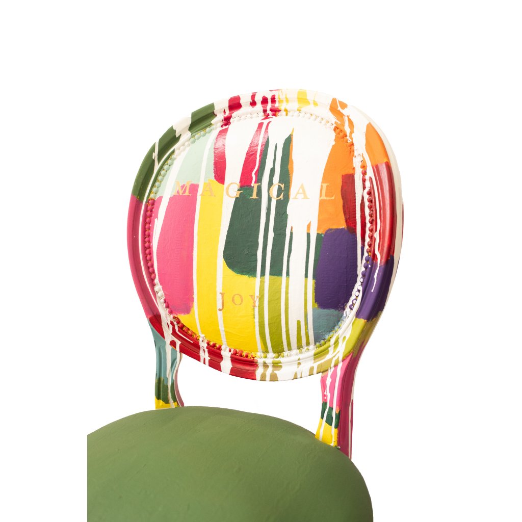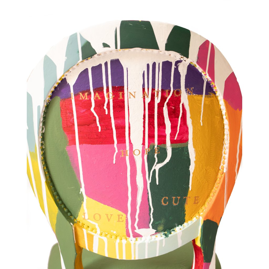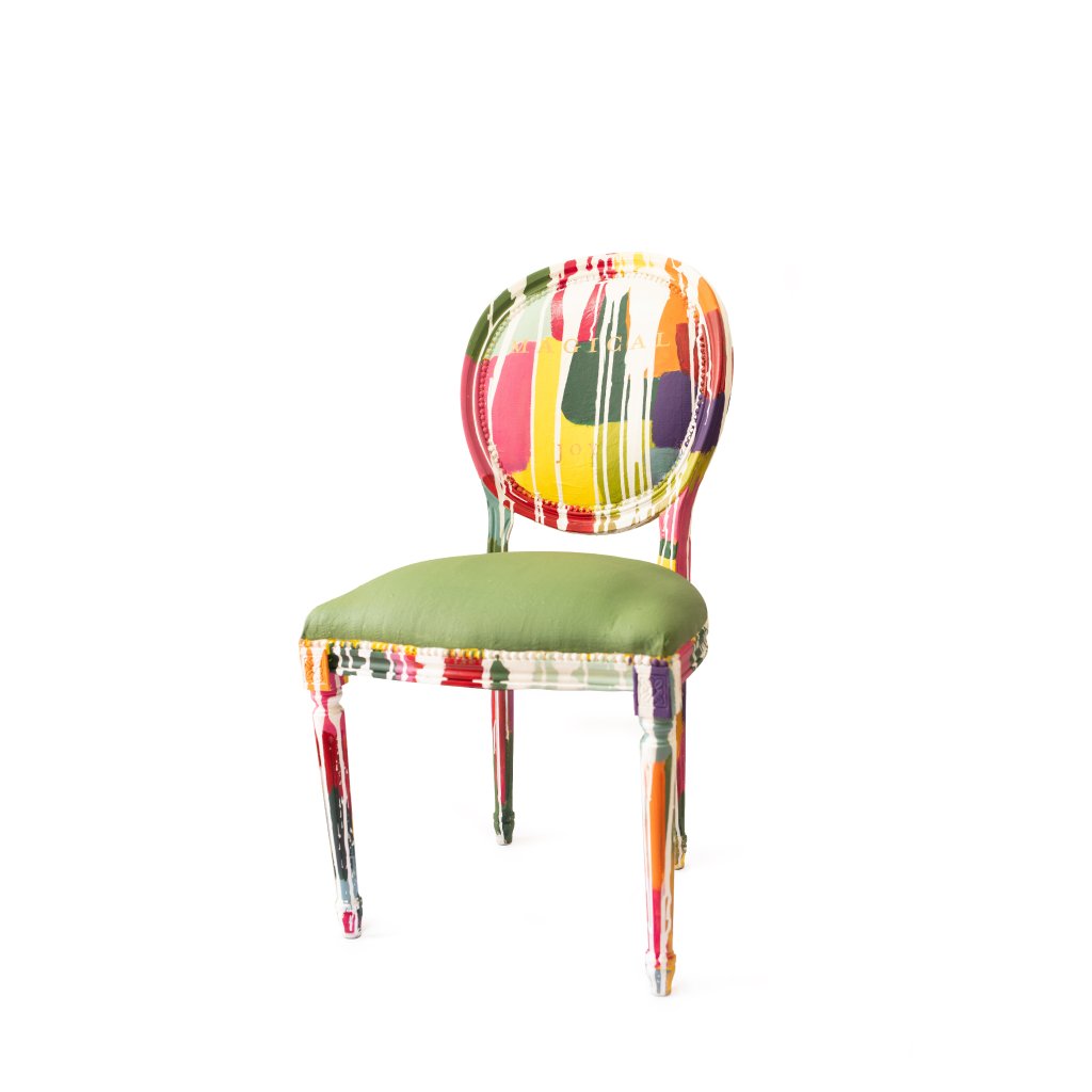 Tahle židle je důkaz, že i klasický tvar může dostat úplně novou energii. Základ tvoří elegantní silueta s kulatou opěrkou a štíhlými nožkami, kterou oživuje kombinace transferu a ruční malby. Motiv na opěrce je přenesen transferem a následně doladěn malbou tak, aby přirozeně zapadl do celkové kompozice.