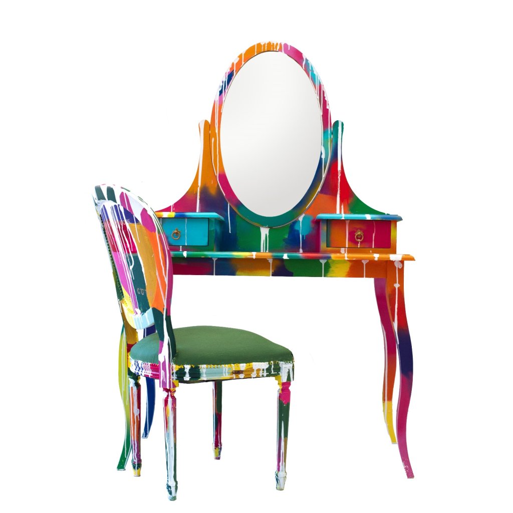 Největší pozornost přitahují barevné stékající tahy – jako kdyby se barva rozběhla po konstrukci a zanechala na ní hravé stopy. Výsledkem je výrazný, moderní kousek, který v interiéru funguje jako umělecký akcent. Skvěle se hodí tam, kde chcete dodat prostoru barvu, nadhled a osobitý příběh.
