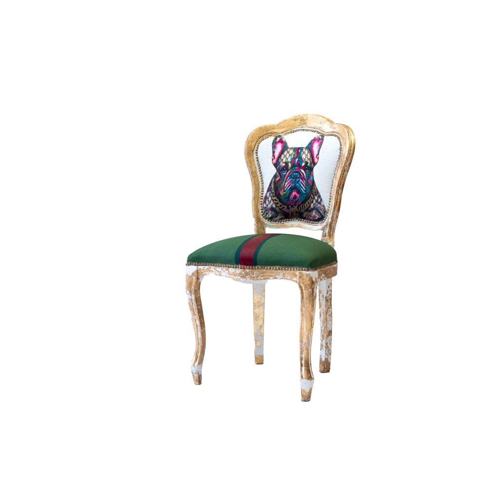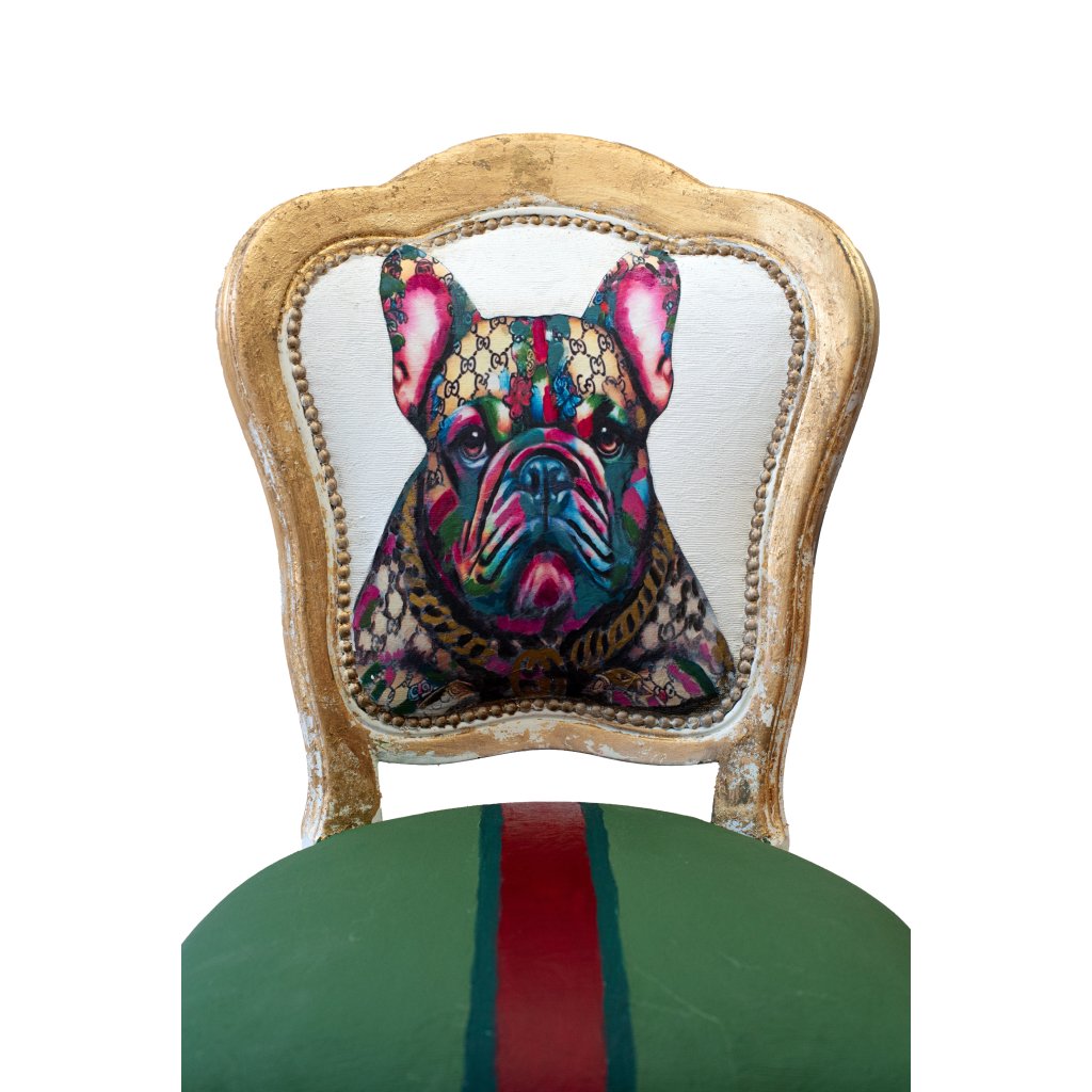 Designová židle Monsieur Chic spojuje noblesu klasického nábytku s hravou současnou ilustrací. Na opěradle se vyjímá portrét francouzského buldočka vytvořený technikou decoupage a citlivě domalovaný, aby přirozeně zapadl do celkového charakteru židle.