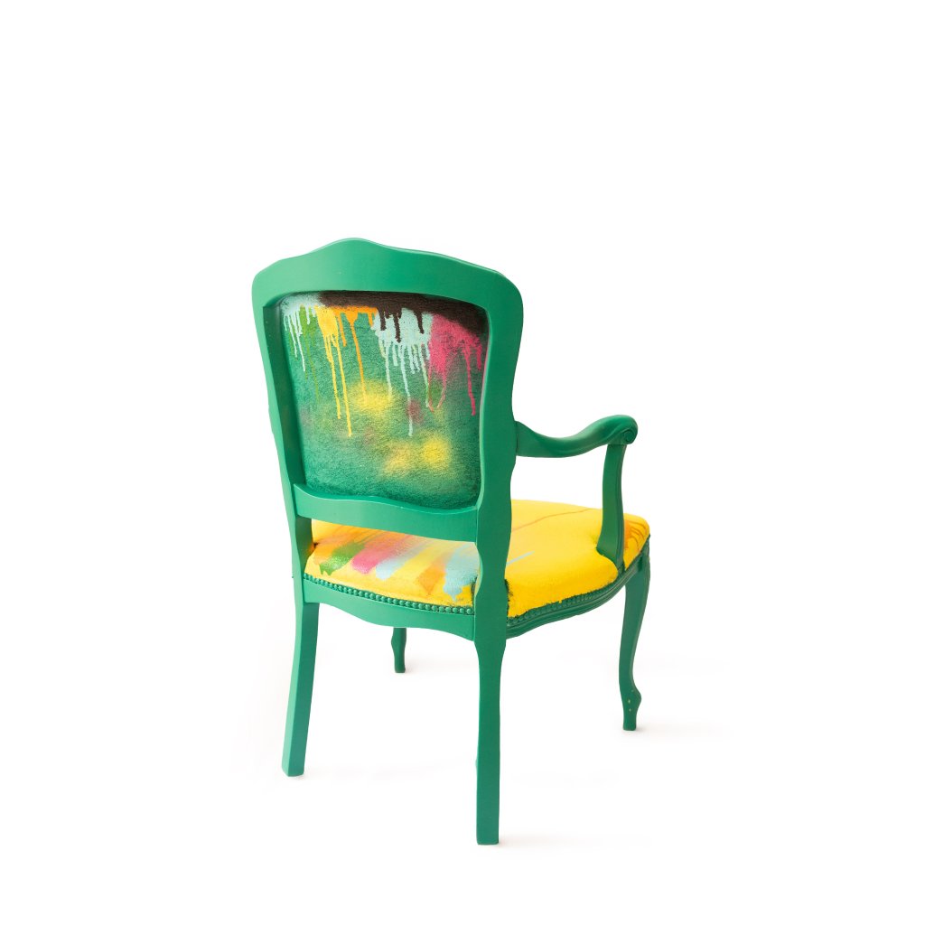 Motiv buldočka s barevnými stékanci barvy přináší do prostoru humor, osobitost a výraznou vizuální stopu. Každý detail je ručně zpracovaný a nese znaky originální autorské práce — od patinovaného rámu až po domalbu na čalounění. Židle se hodí jako solitér do moderních interiérů, galerií, butiků nebo kreativních kanceláří, kde má nejen funkci sezení, ale i roli uměleckého objektu.