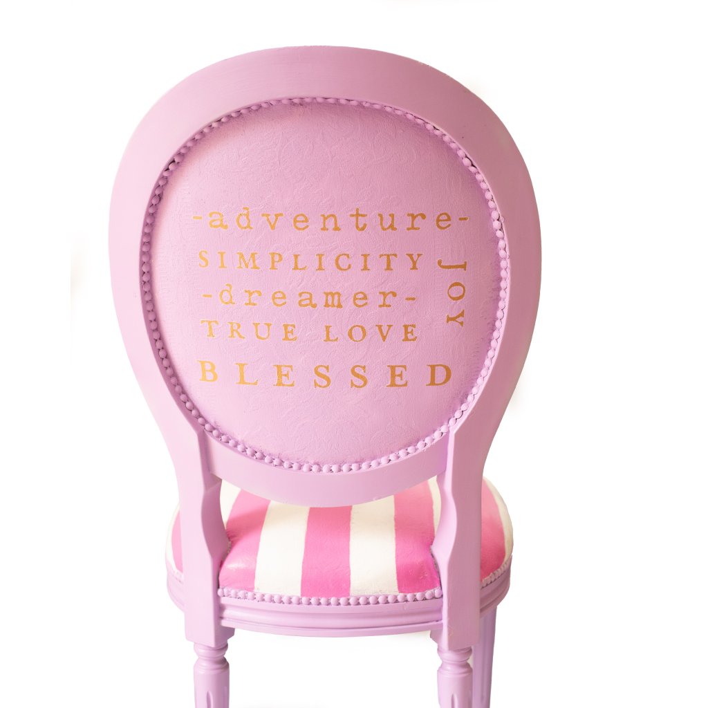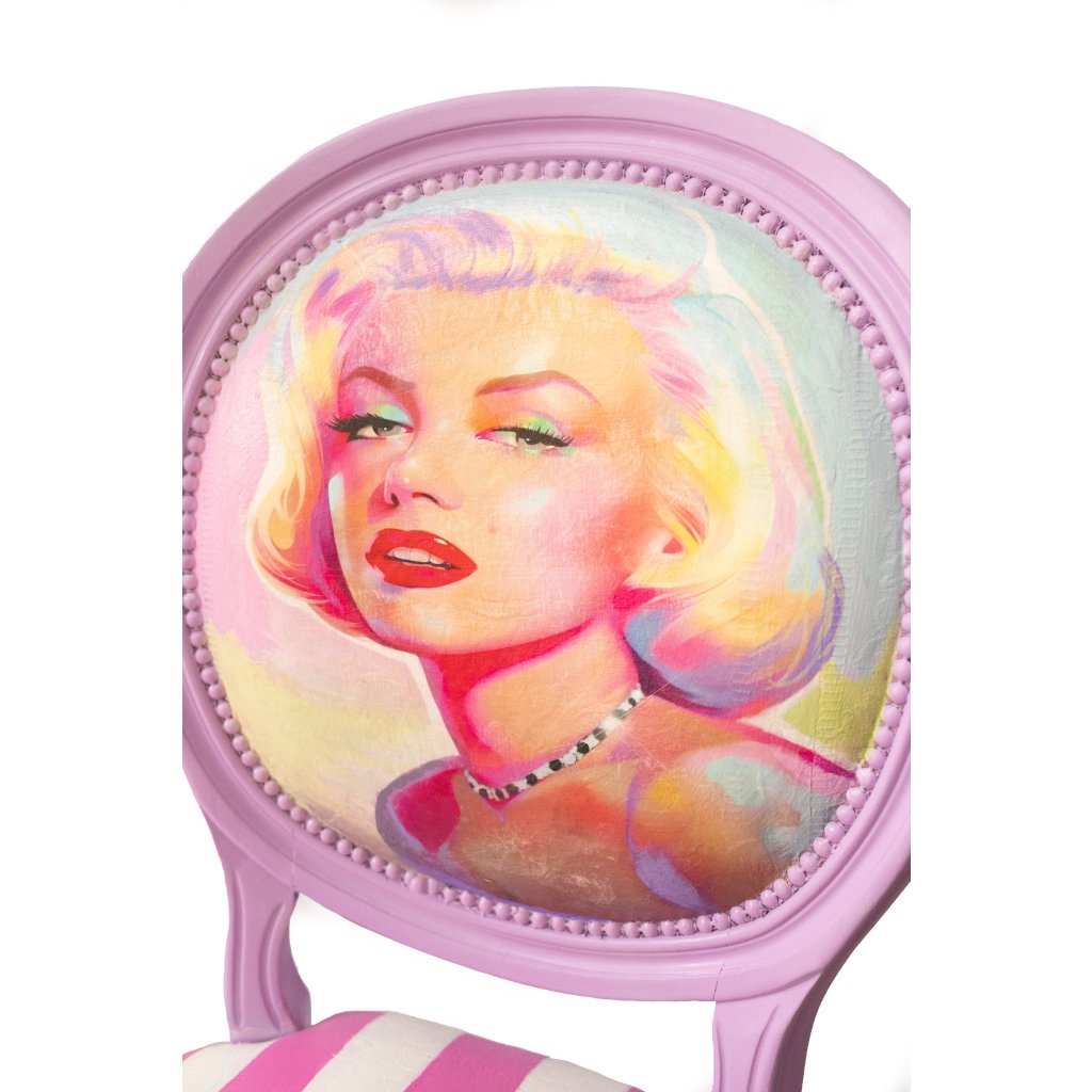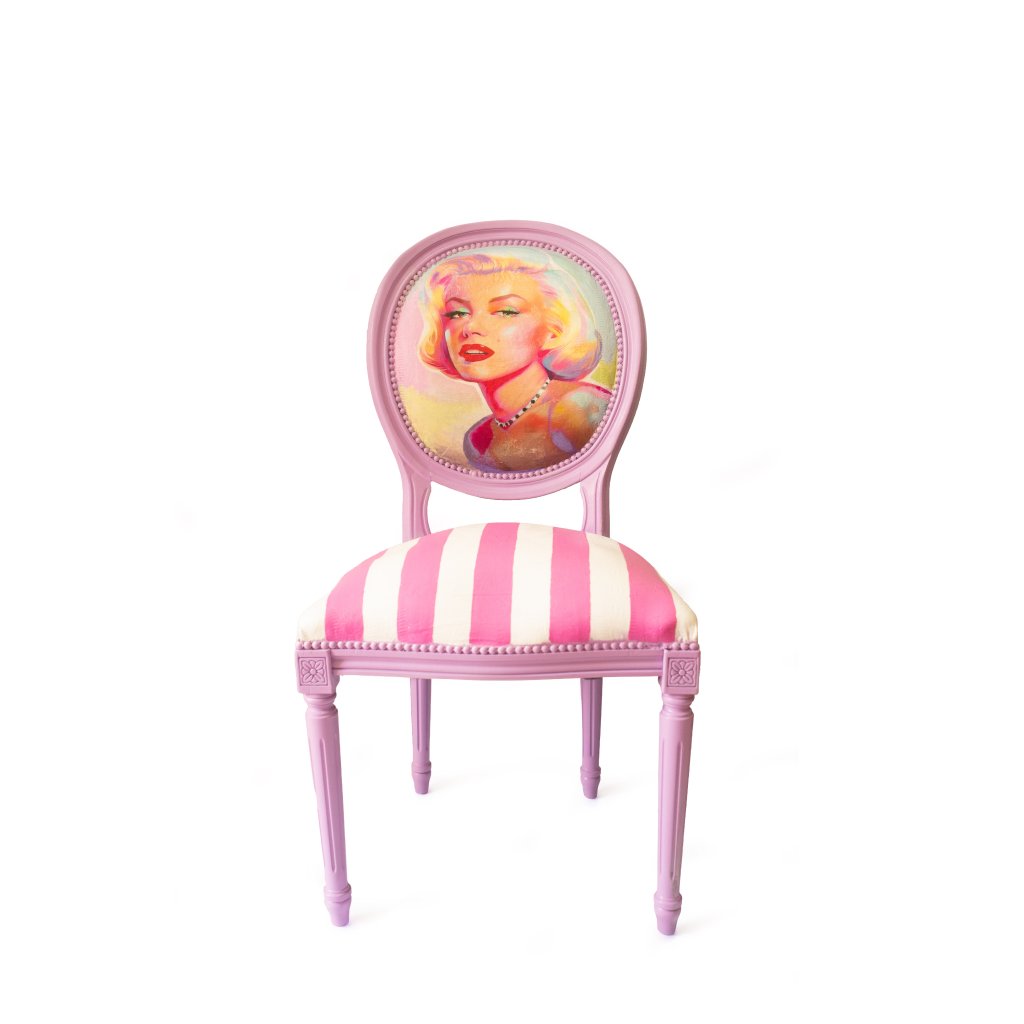 Tato originální designová židle spojuje klasický tvar inspirovaný historickým nábytkem s moderním uměleckým pojetím. Jemně růžová konstrukce kontrastuje s výrazným portrétem na opěradle, který evokuje atmosféru starého Hollywoodu a nadčasového glamour stylu. Sedák s růžovo-bílými pruhy dodává židli lehkost a hravost, zatímco ručně zpracované detaily podtrhují její jedinečnost.