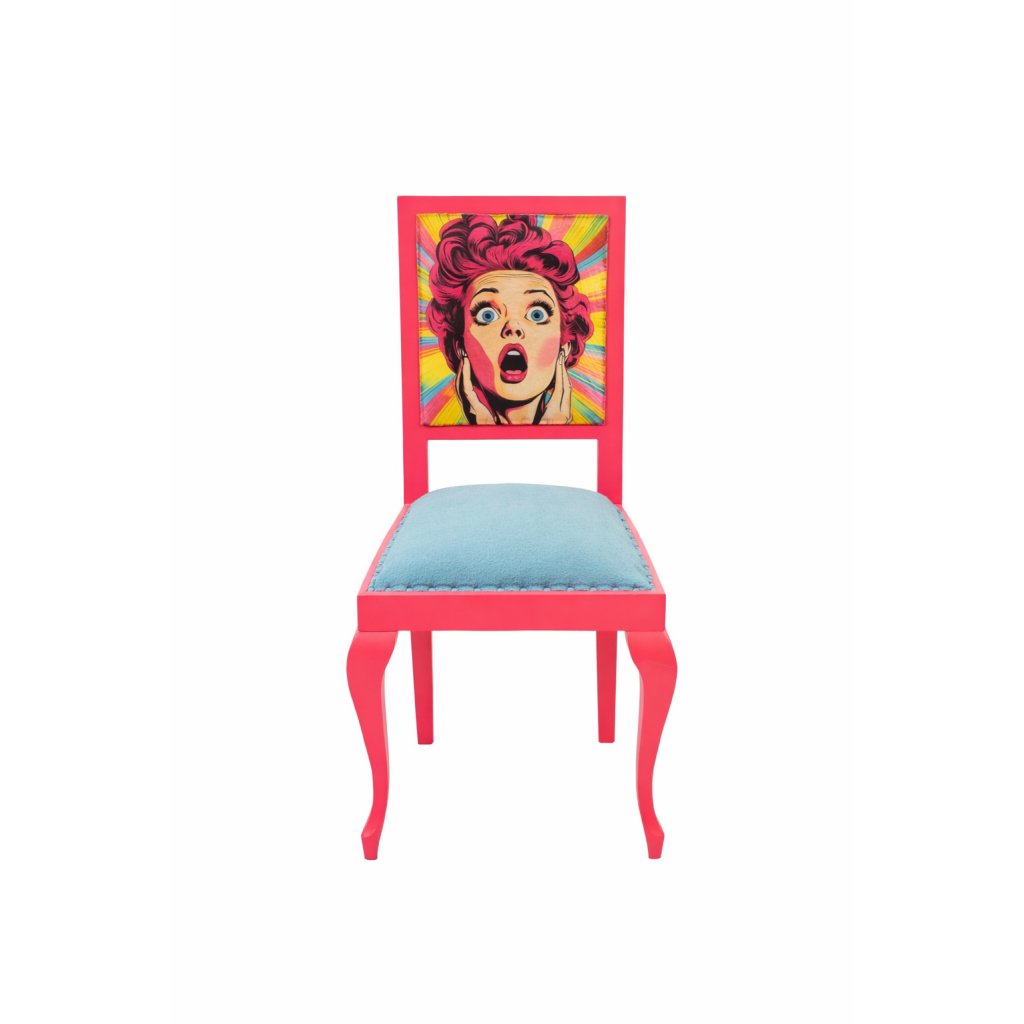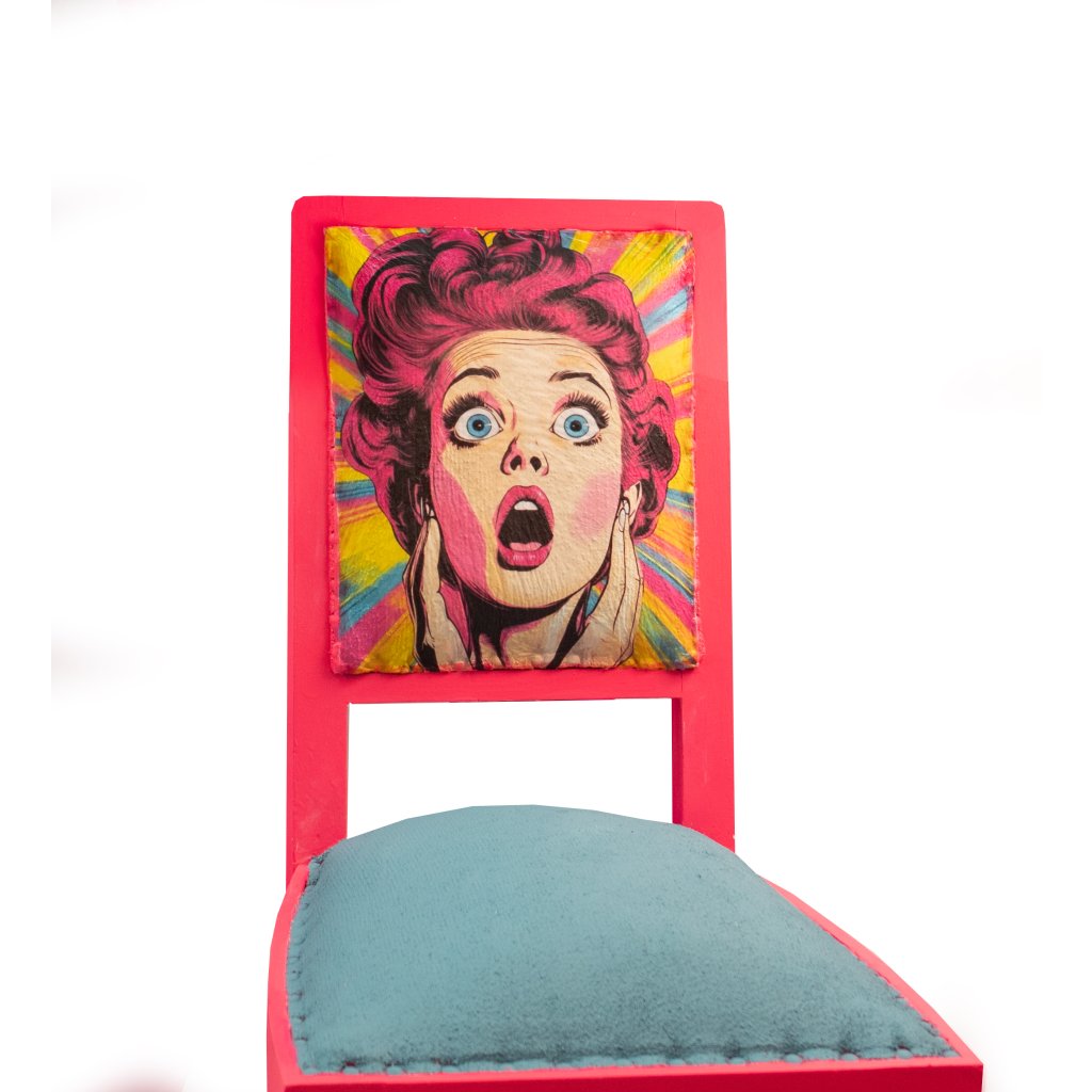 Designová židle Pop Art překvapení spojuje klasický tvar židle s výrazným moderním motivem inspirovaným komiksovou estetikou. Motiv na opěradle je vytvořen technikou decoupage a následně ručně domalován, aby přirozeně zapadl do barevného rámu židle.