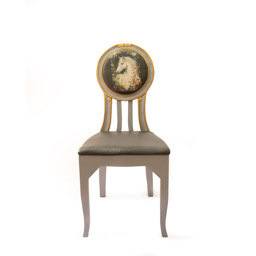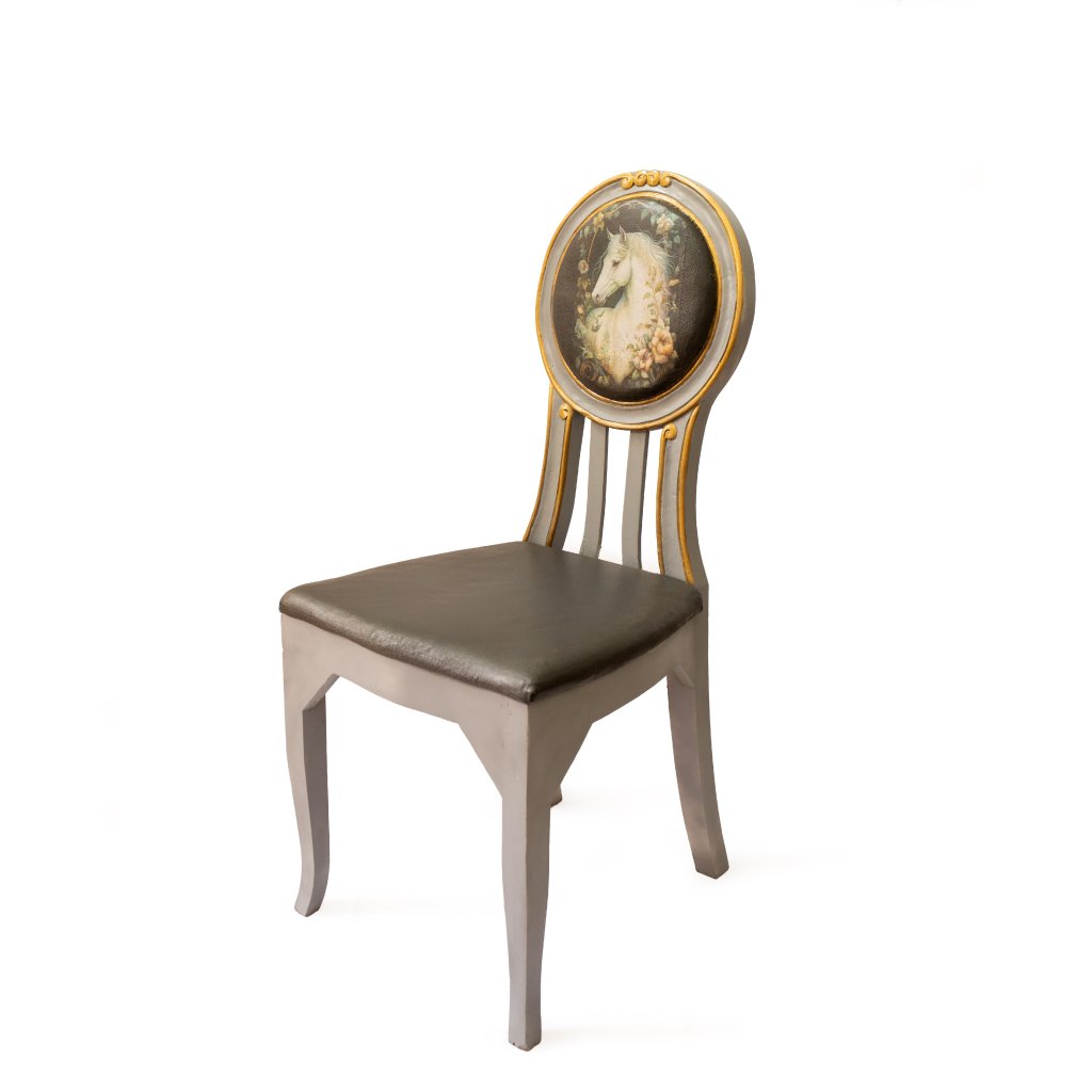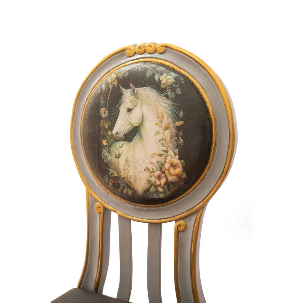 Designová židle Sedlo snů působí jako pohádkový objekt s nádechem nostalgie a jemné elegance. Motiv koně vznikl technikou decoupage a je citlivě ručně domalovaný tak, aby plynule navazoval na patinovaný rám židle.