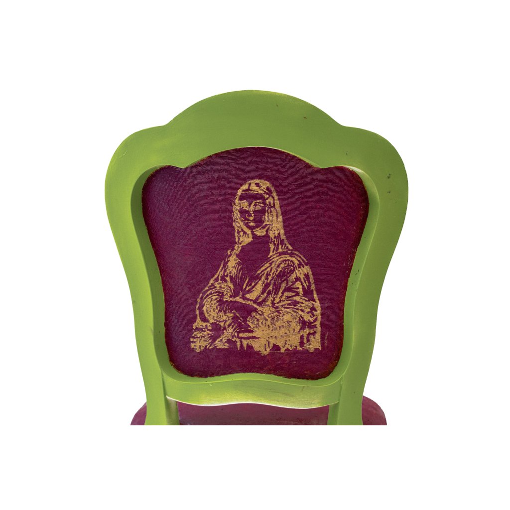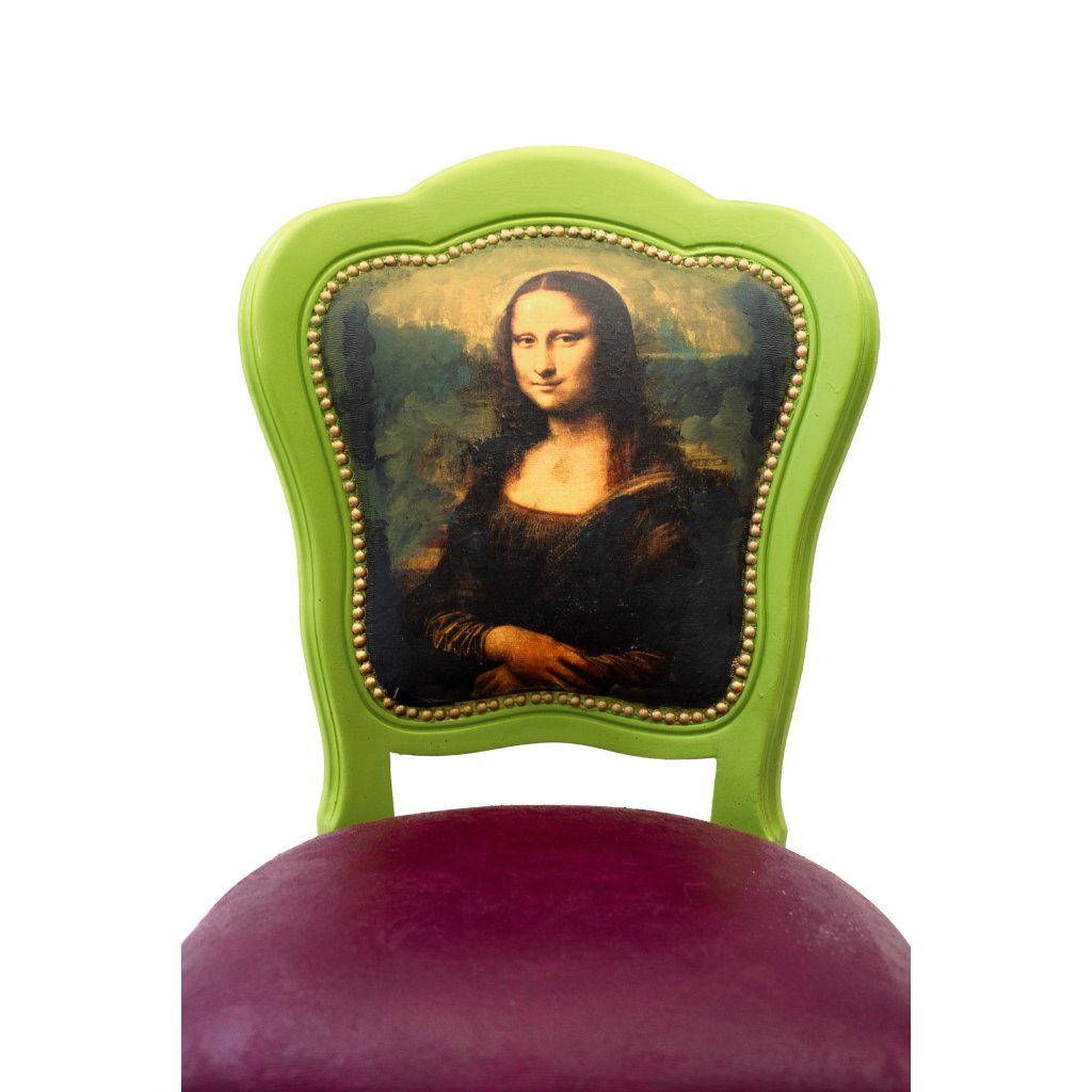 Designová židle Za úsměvem Mony Lisy je originální solitér, který si pohrává s ikonou světového umění a přenáší ji do současného interiéru v nečekaných barvách. Motiv Mony Lisy na opěradle vznikl technikou decoupage a je jemně domalovaný, aby přirozeně splynul s rámem a celkovým výrazem židle.