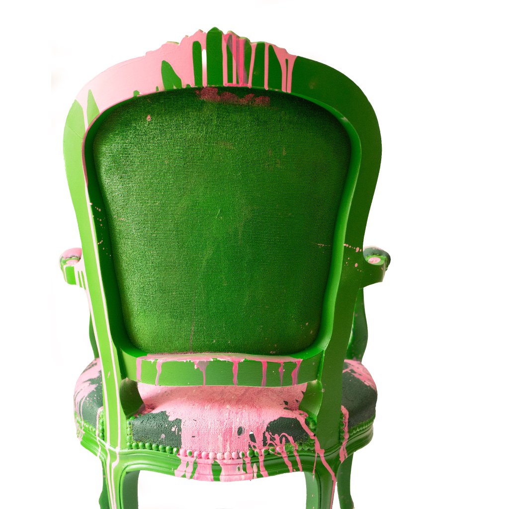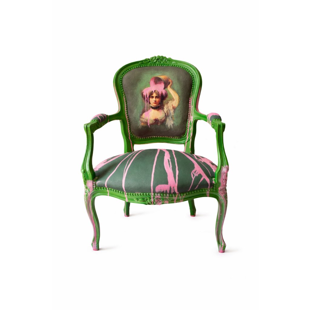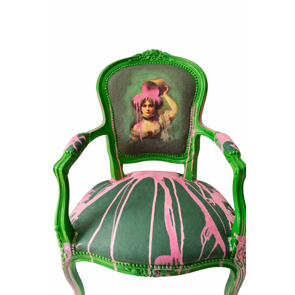 Křeslo „Dáma v kýblu“ je originální solitér, který propojuje historizující formu s výrazným současným výtvarným jazykem. Jemný portrét ženy je narušen a zároveň zvýrazněn spontánním růžovým barevným gestem, které dává celé kompozici energii, nadhled i lehkou provokaci. Kontrast mezi elegantním zeleným rámem, klasickým motivem a moderní intervencí vytváří silný vizuální efekt. Každý kus je ručně upravený originál, který funguje nejen jako nábytek, ale i jako umělecký objekt.