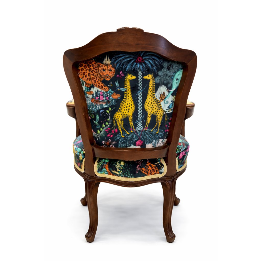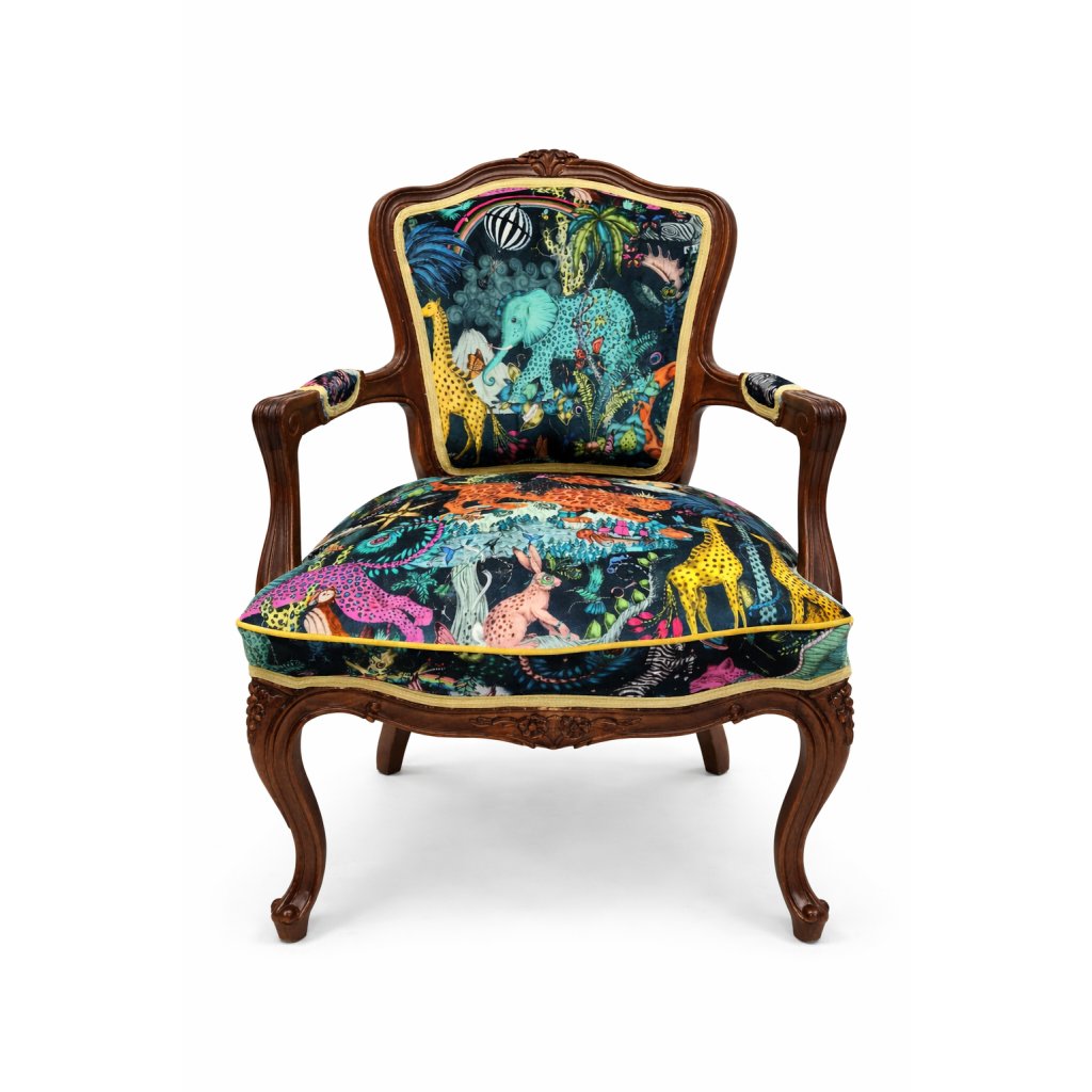 Jungle Art Statement je jedinečné solitérní křeslo, které spojuje klasickou eleganci historického nábytku s odvážným moderním textilem plným barev, zvířecích motivů a ilustrací inspirovaných přírodou.