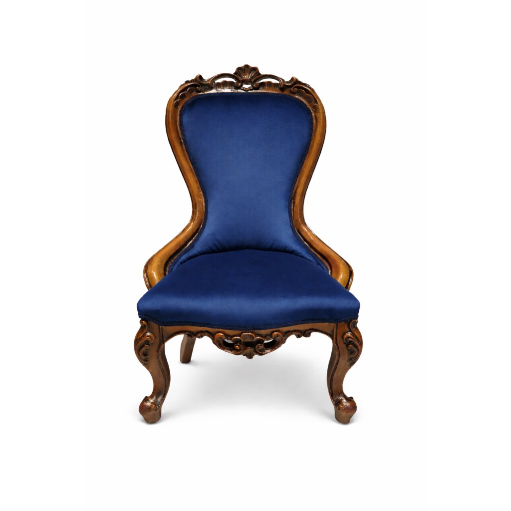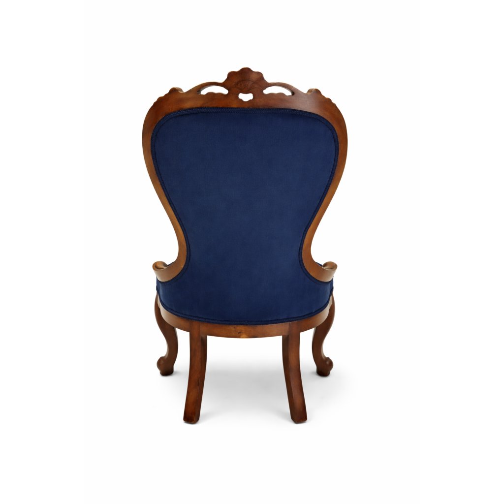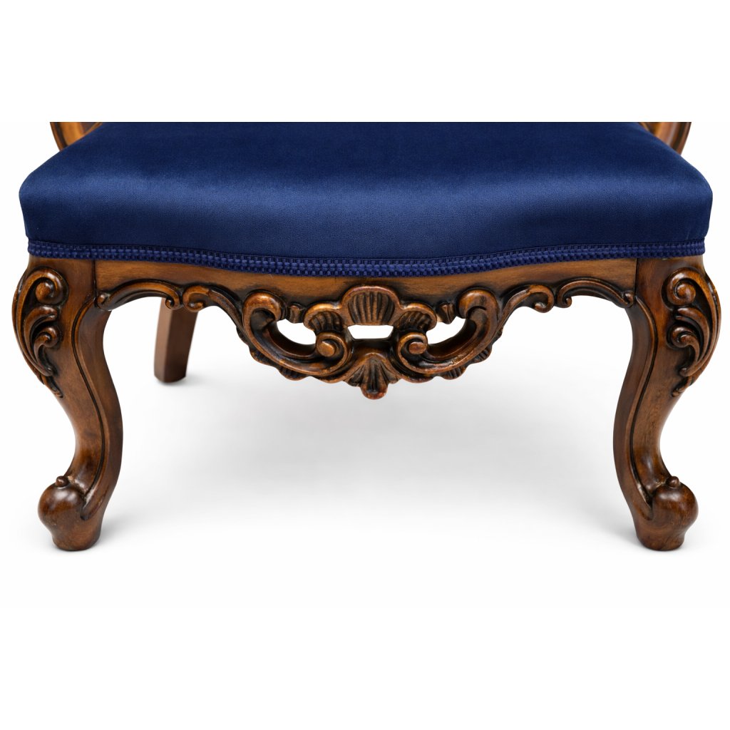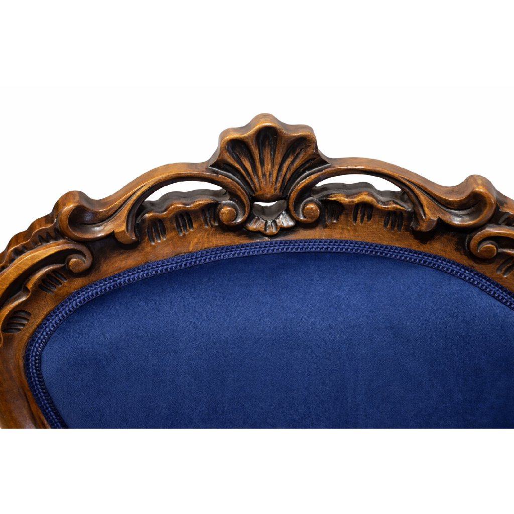 Royal Blue Heritage je originální solitérní křeslo inspirované barokním stylem. Masivní dřevěná konstrukce s dekorativními řezbami dodává nábytku noblesní charakter, zatímco nové čalounění v sytém tmavě modrém odstínu přináší moderní a luxusní vzhled.