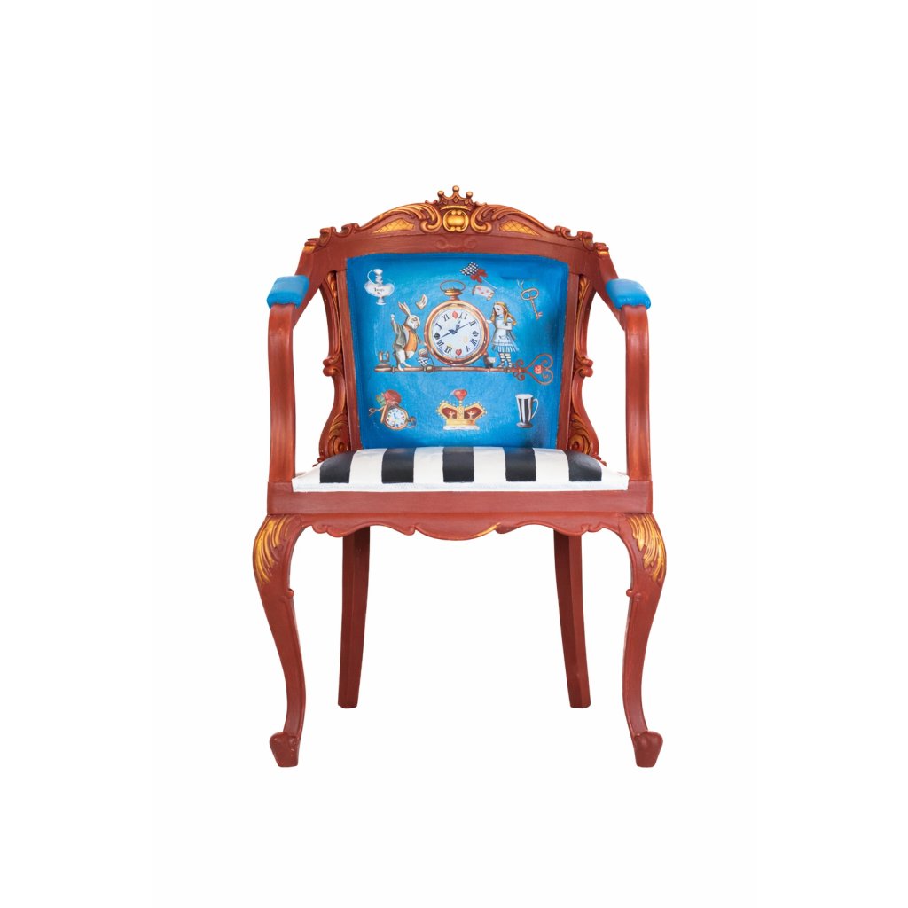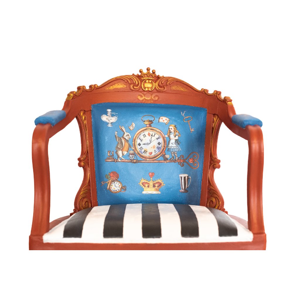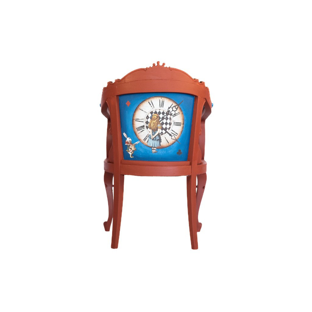 Designové křeslo V říši času je originální solitér, který v sobě propojuje klasický tvar s fantazijním příběhem. Na opěradle najdete výraznou kompozici s hodinami a hravými detaily, která vznikla technikou decoupage a je citlivě domalovaná, aby plynule navazovala na celkovou barevnost křesla.