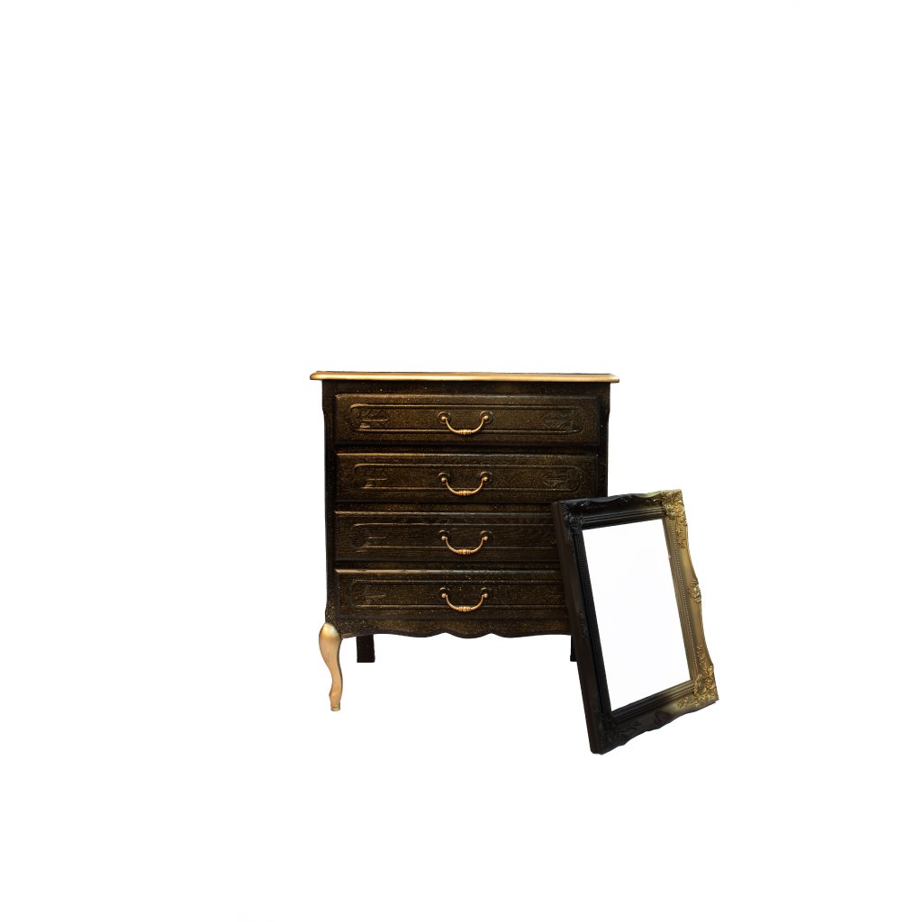 Zrcadlo Black Royale je výrazným designovým doplňkem, který v sobě spojuje klasickou eleganci a moderní kontrast. Bohatě zdobený rám inspirovaný barokní estetikou je ručně upraven do hluboké černé barvy a jemně zvýrazněn zlatou patinou v detailech a ornamentálních prvcích.