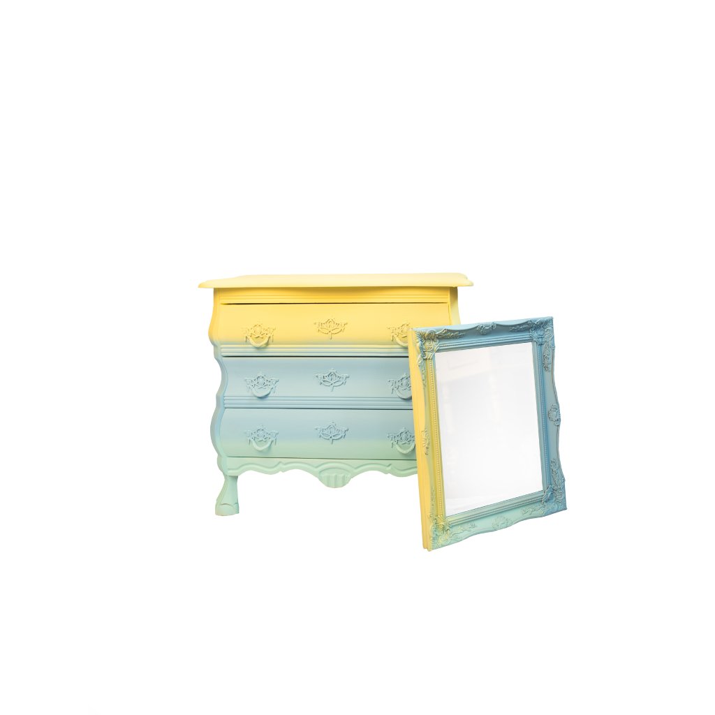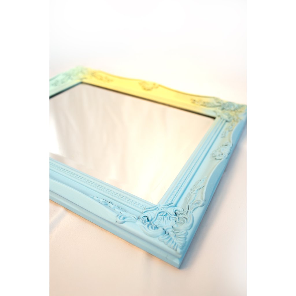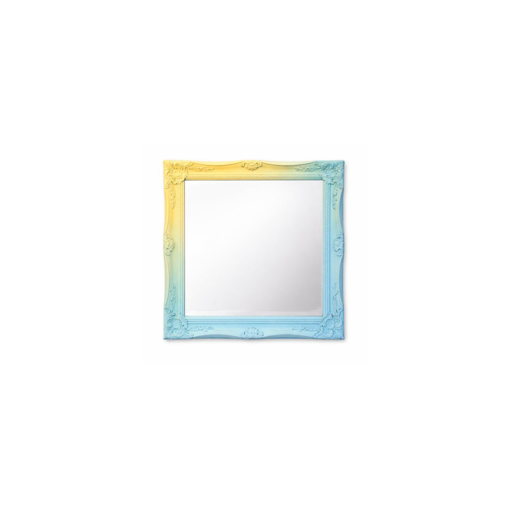 Zrcadlo Pastel Royale je výrazným, ale zároveň jemným designovým prvkem, který propojuje klasickou ornamentální formu s moderním barevným pojetím. Bohatě zdobený rám inspirovaný barokní estetikou je ručně upraven do elegantního pastelového ombré přechodu od světle modré po teplý zlatavý tón.