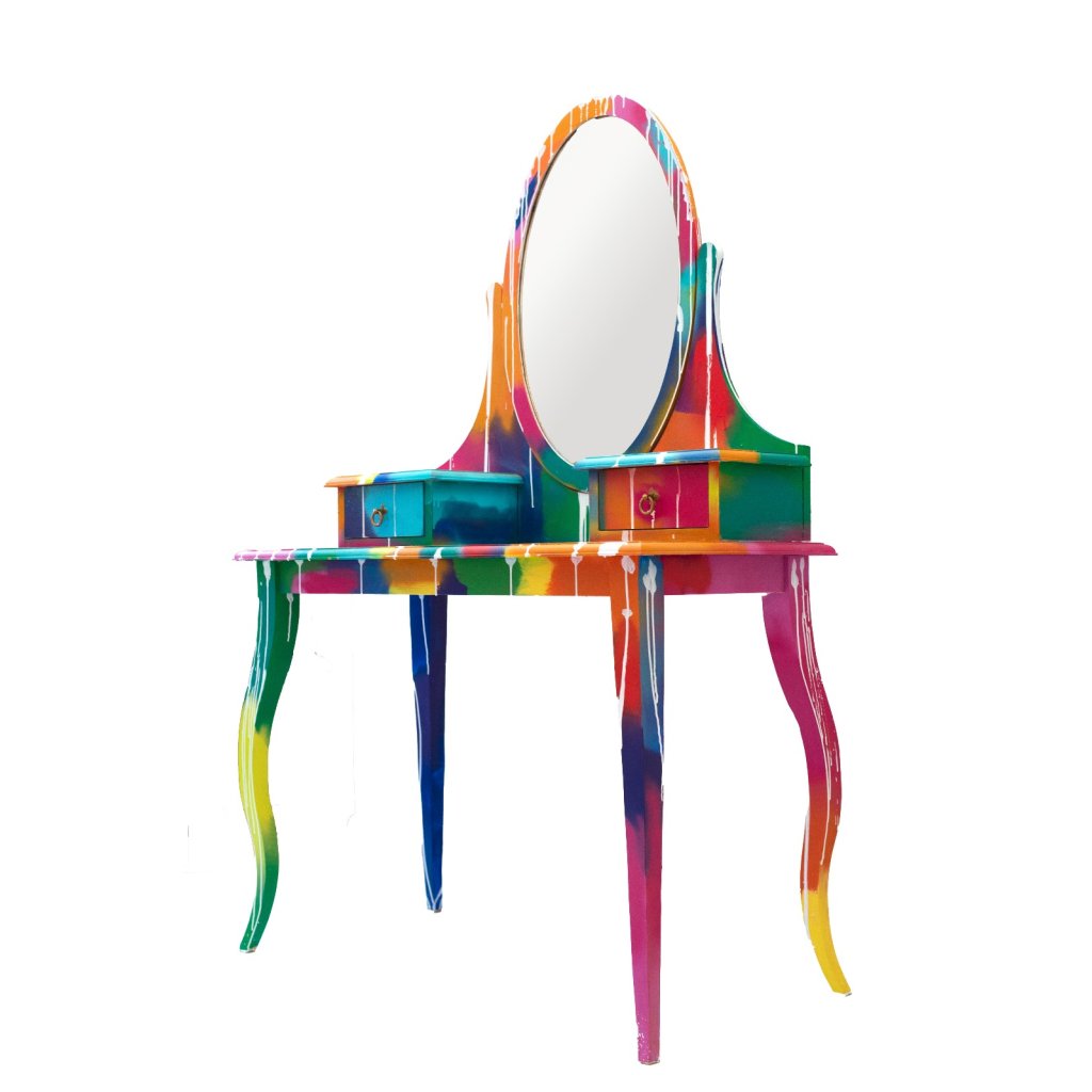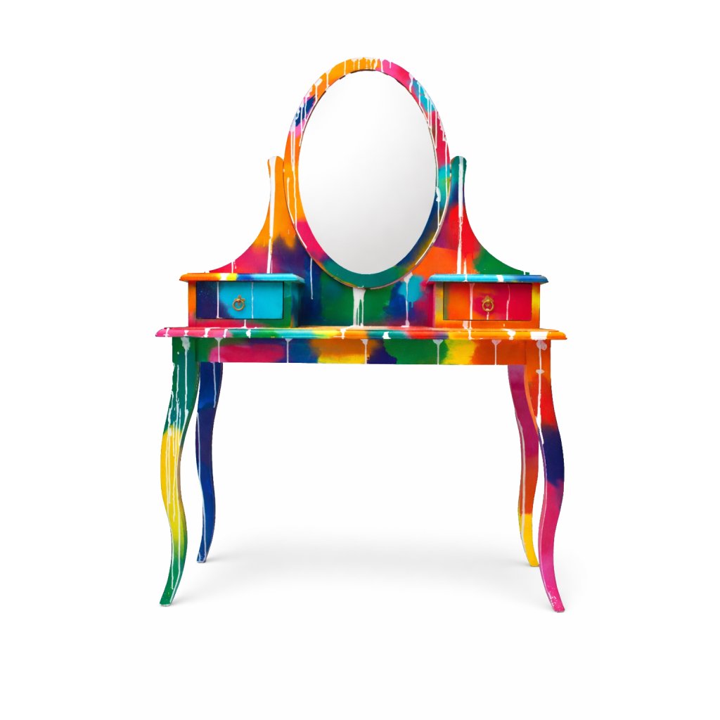Designový toaletní stolek Rainbow Muse je originálním spojením klasického tvarosloví a současného uměleckého výrazu. Elegantní silueta s jemně prohnutými nohami a oválným zrcadlem dostává nový život díky ruční malbě v duhových barevných přechodech s efektem stékající barvy.