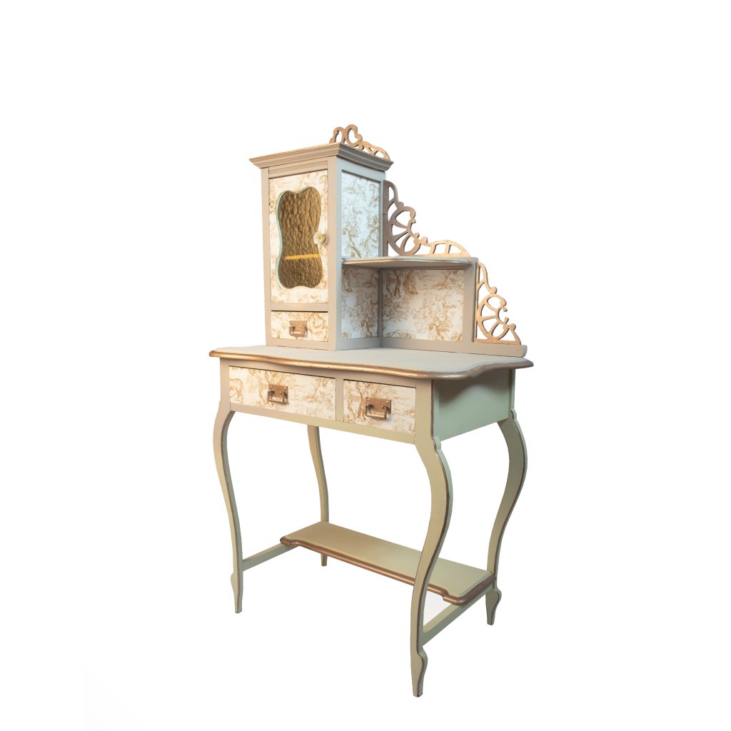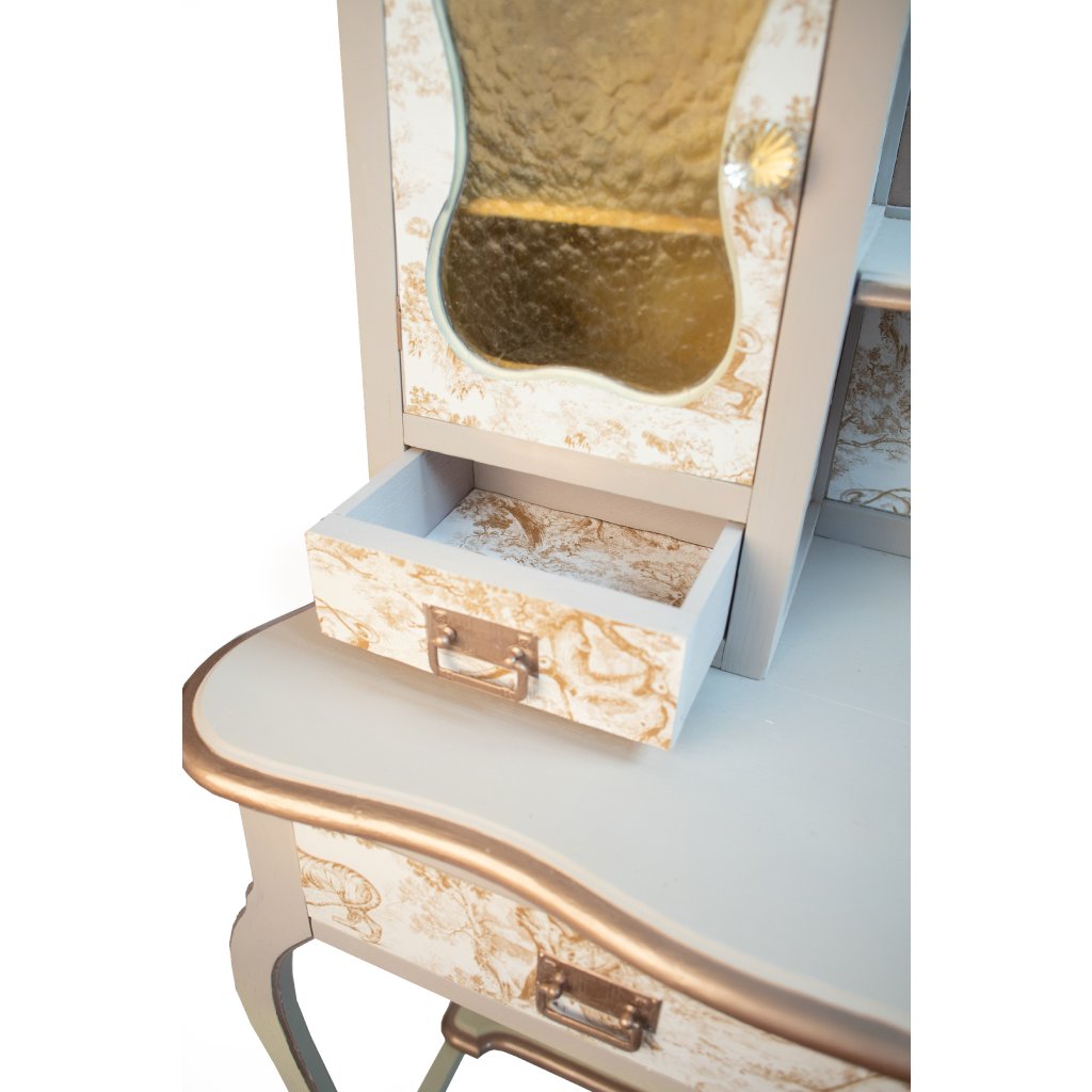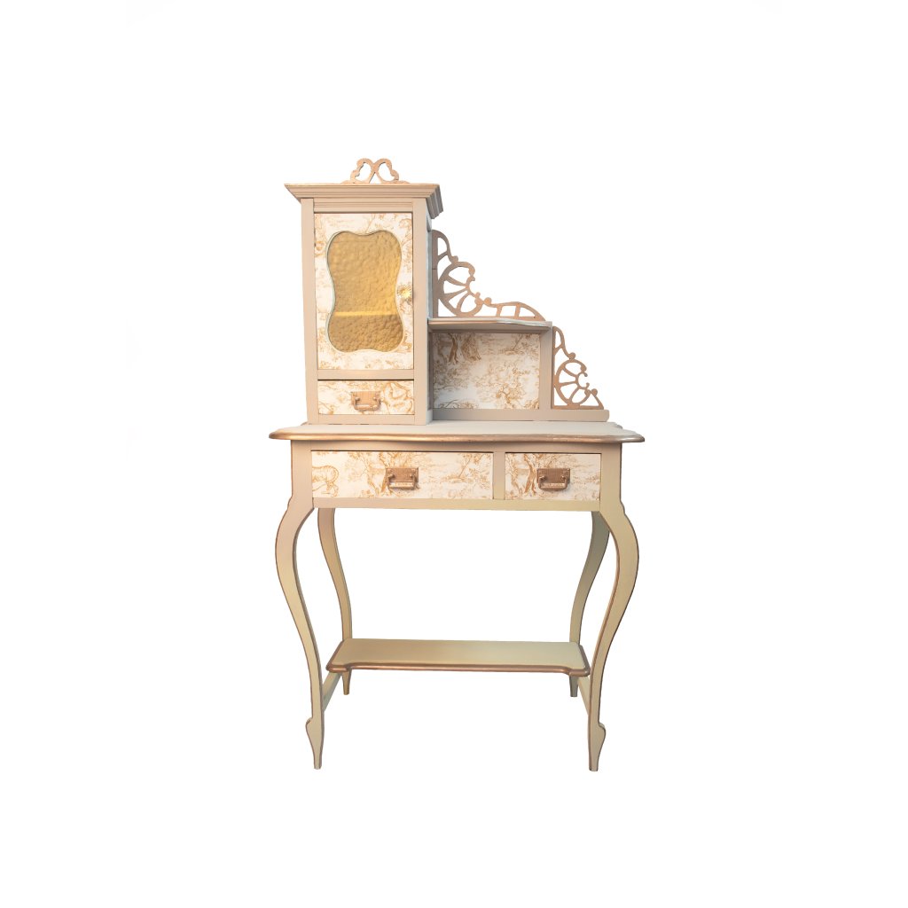 Designový toaletní stolek ve francouzském vintage stylu, který v sobě spojuje jemnou eleganci, dekorativní detaily a praktické využití. Světlý krémový základ doplněný o klasický vzor toile de Jouy vytváří nadčasový a velmi ženský dojem, který krásně oživí ložnici, šatnu nebo kosmetický koutek. Jemná patina na hranách zvýrazňuje tvarování a podtrhuje autentický charakter ručně renovovaného kusu.