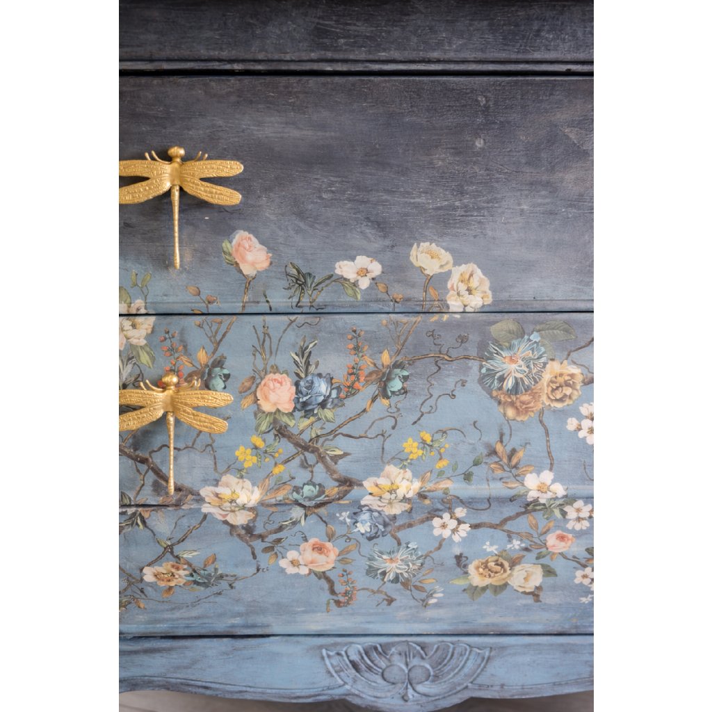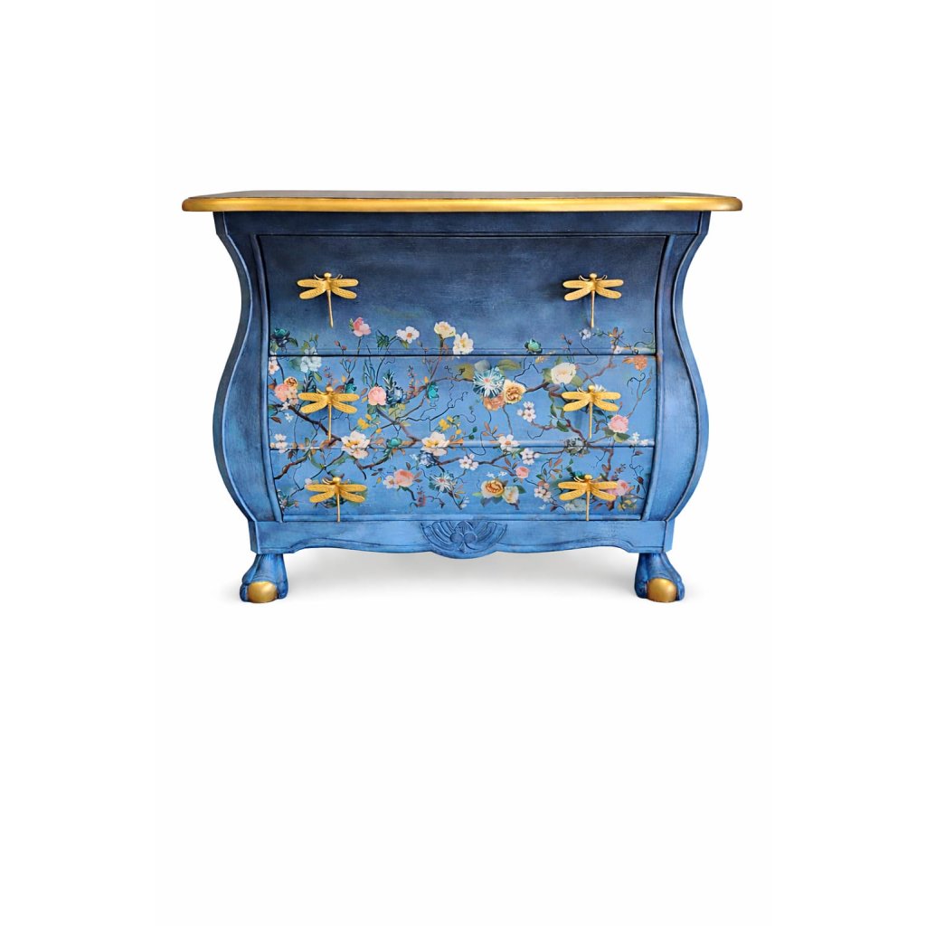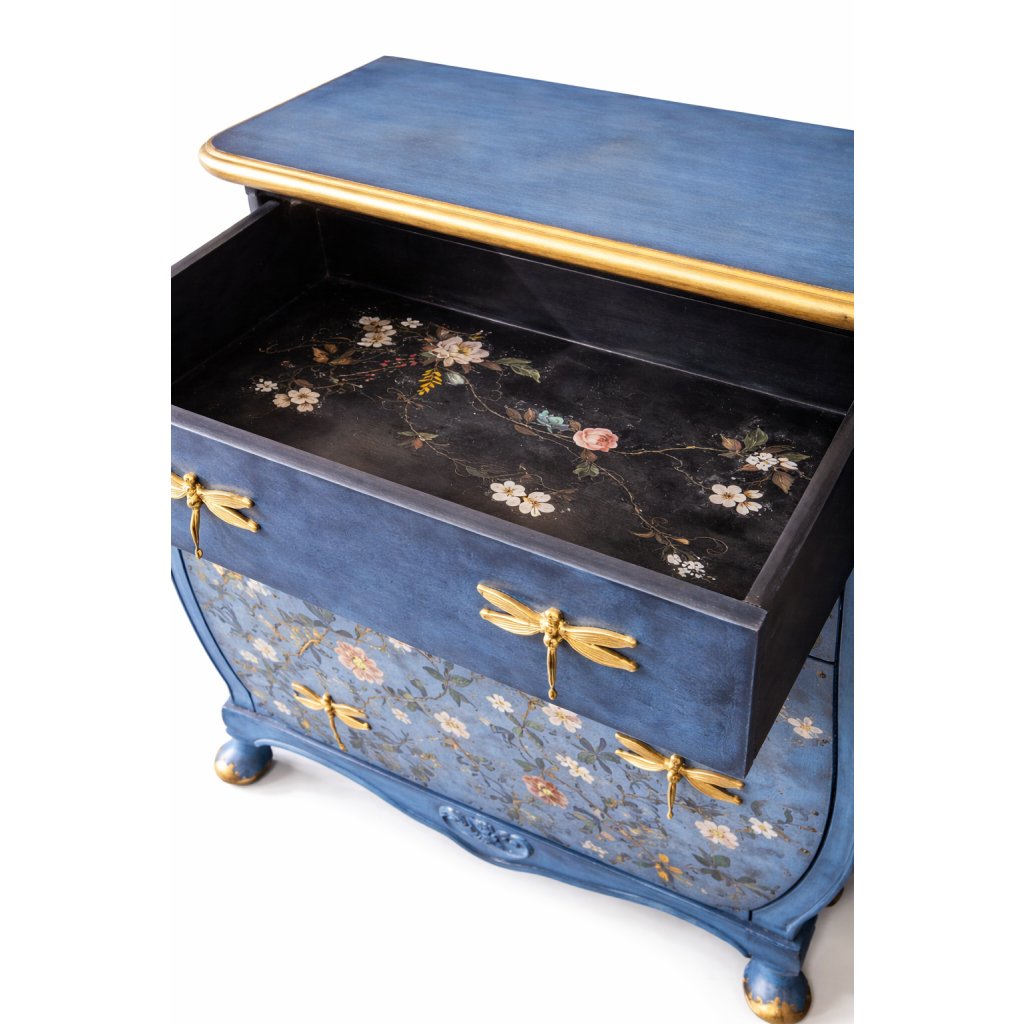 Komoda Vážková zahrada je výjimečný designový kousek, který spojuje romantiku květinových motivů s výraznými zlatými detaily. Sytě modrý podklad vytváří dokonalé plátno pro rozkvetlé větve, jemné pastelové květy a dekorativní vážky, které slouží jako stylové úchytky zásuvek.